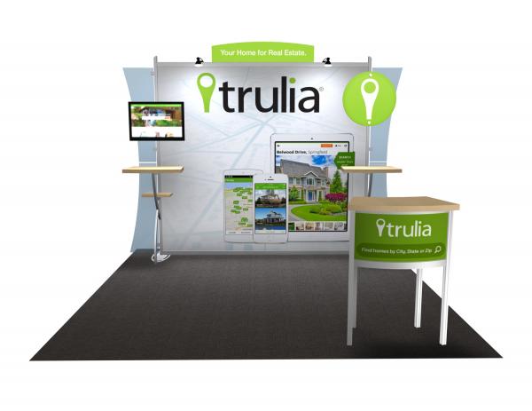 The rental exhibits gallery includes a variety of workstations with locking doors for storage, product shelves, and monitors. The arch-shape and flat canopies add an attractive design element to many rental design options. Most of the inline rental exhibits pack and ship in one crate and are easy to set up. For your peace of mind, we stage and photograph every exhibit before shipping to ensure your graphics look great and fit perfectly.