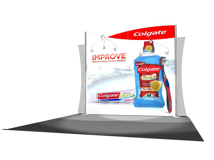 Quite often, a few custom elements added to the design can give the entire design a custom look even if it’s as simple as some colorful laminated workstations, shelves, or a reception counter. Custom laminated soffits and backlighting are also nice touches that are inexpensive and well worth the investment. As a bonus, if you re-rent the same exhibit, your second rental will most likely be less expensive, since your first rental covered the cost of those custom components.