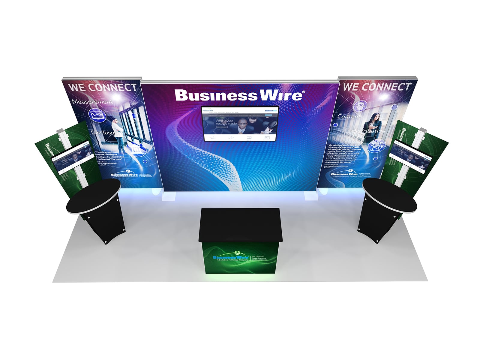 When it's ALL BUSINESS, consider the RE-2099 rental exhibit. The large backlit graphics will attract attention, and the balanced design with monitors left, right, and center makes it easy to demo products and services with multiple trade show attendees. The RE-2099 comes with (2) RE-1223 Workstations with monitor, graphics, and locking storage. The RE-1567 reception counter is backlit and includes ample locking storage. This rental exhibit means business!