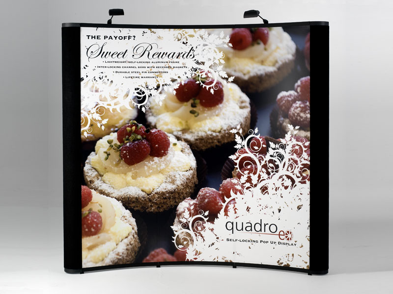 The fabric or graphic panels hang on pins that adhere to detachable channel bars with a magnet-to-magnet connection. The panels are rollable to fit in the roto-molded case with wheels. The number of panels depends on the size of the frame.