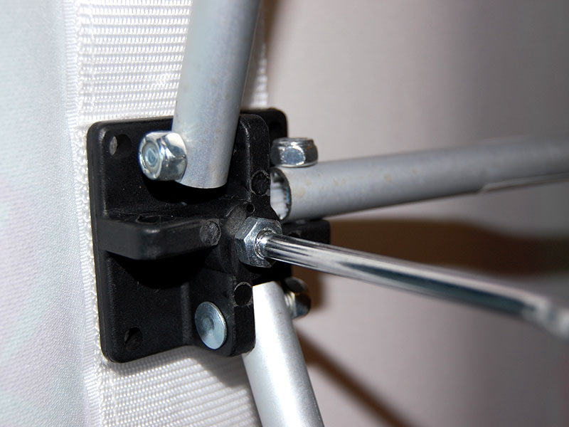 Self-locking pop-ups are perfect for Velcro compatible fabrics and murals, but are not ideal for tension fabric graphics We use a frame with manual locks because it creates a more rigid structure which evenly pulls out any wrinkles or folds in the fabric graphic. The result is a taut flat graphic that mimics a hard panel graphic.