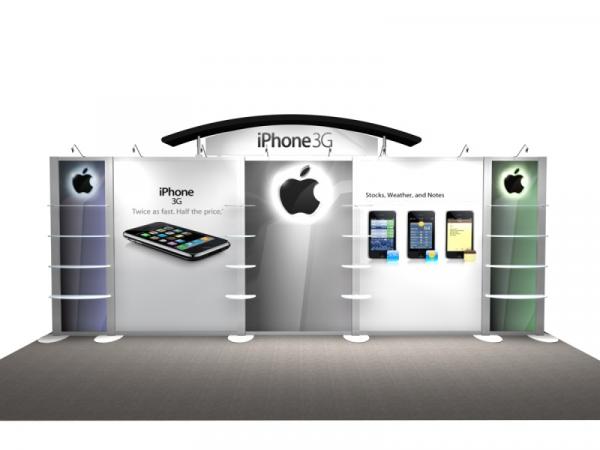 The rental exhibits gallery includes a variety of workstations with locking doors for storage, product shelves, and monitors. The arch-shape and flat canopies add an attractive design element to many rental design options. Most of the inline rental exhibits pack and ship in one crate and are easy to set up. For your peace of mind, we stage and photograph every exhibit before shipping to ensure your graphics look great and fit perfectly.