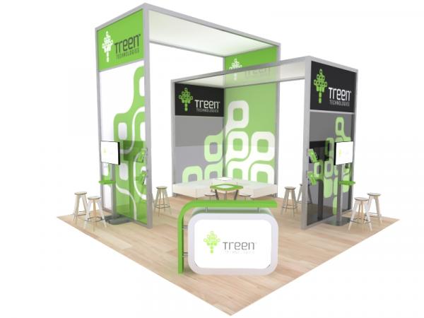 We often hear, "I'd like a comfortable booth space where customers can lounge and hear about our products and services." The VK-5096 does that ... and more! The large graphics and open construction invites attendees into your booth. Once there, they can sit at bar-height tables next to large monitors or relax in a semi-private lounge area. The layout makes it easy to engage your customers in face-to-face conversations or presentations. The island design includes an attractive reception counter with backlighting and storage. The large tension fabric graphics and engineered aluminum construction ensures a fast setup and years of use.