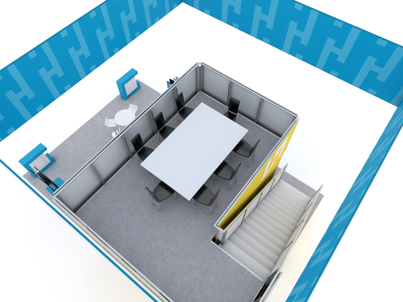 A double-deck is a commitment. It requires a belief in your brand, your marketing, and your team on the trade show floor. The upside is huge. More visibility, increased traffic, and higher status in the show hall. The VK-5155 transforms your commitment into reality with reception counters, monitor workstations, and a casual lounge. The double-deck elevates and expands your graphic messaging on tension fabric and videos. In addition, there an attractive charging table with LED perimeter lights and the option of a private conference room on the second level.
