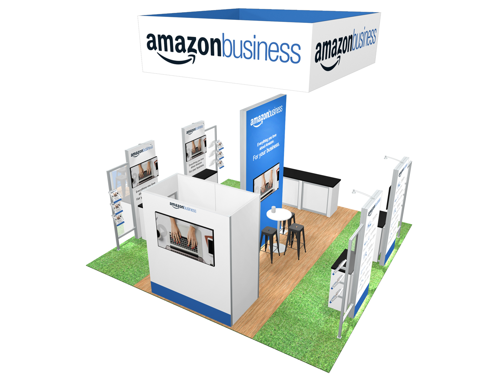 A well-designed rental island exhibit should be attractive, inviting, informative, and practical. The RE-9127 does all that... and more. It combines lightboxes and vibrant graphics with functional monitor kiosks in a booth design that welcomes business conversations and problem solving. There are multiple locking counters and a full-size closet for secure storage. The 12 ft. high central tower include meeting area. Finally a large square overhead hanging sign ensures visibility throughout the exhibit hall.