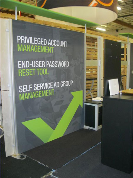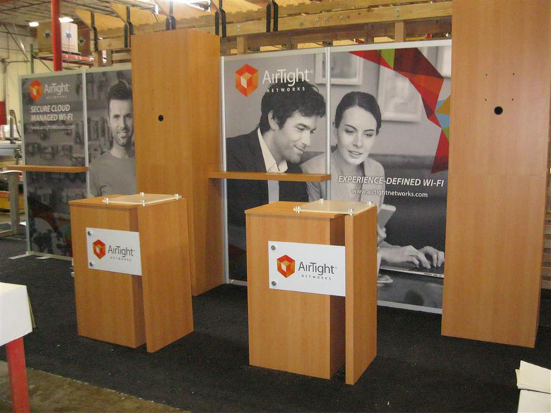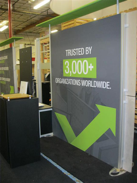 Modified ecoSmart ECO-1067 Sustainable Exhibit with Fabric and Direct Print Graphics, Canopy, Shelves, Backwall Counter, Monitor Mount and ECO-33C Podium Modified ecoSmart ECO-1067 Sustainable Exhibit with Fabric and Direct Print Graphics, Canopy, Shelves, Backwall Counter, Monitor Mount and ECO-33C Podium