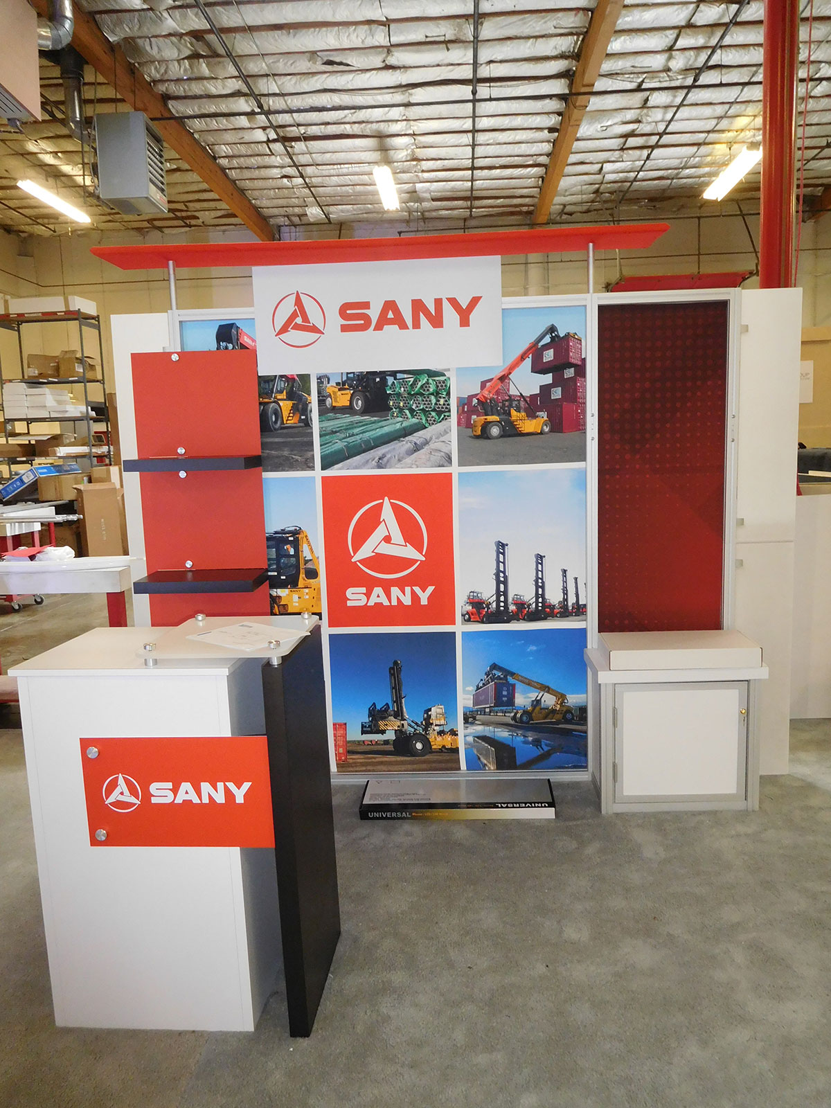 eSmart Custom Exhibit with Lightweight Recycled Aluminum SEG Frame and Storage Towers with Doors. Includes LED Lights, Monitor Mounts, Shelves, and ECO-33C Storage Counter with Locking Door -- Image 1 eSmart Custom Exhibit with Lightweight Recycled Aluminum SEG Frame and Storage Towers with Doors -- Image 2 eSmart Custom Exhibit with Lightweight Recycled Aluminum SEG Frame and Storage Towers with Doors -- Image 3 eSmart Custom Exhibit with Lightweight Recycled Aluminum SEG Frame and Storage Towers with Doors -- Image 4