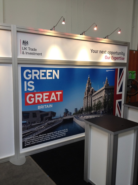 RENTAL: Modified RE-2009 with (3) RE-1202 Counters, (8) Halogen Arm Lights, (8) Small Clear Acrylic Shelves, Tension Fabric Graphics, and Sintra Header and Counter Graphics