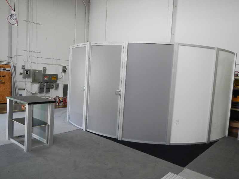 RENTAL: Modified RE-1017 with (2) RE-1202 Counters with Locking Doors, Laminated Ceiling with Puck Lights, Arched Header, Large Monitor Mount, and Literature Shelf