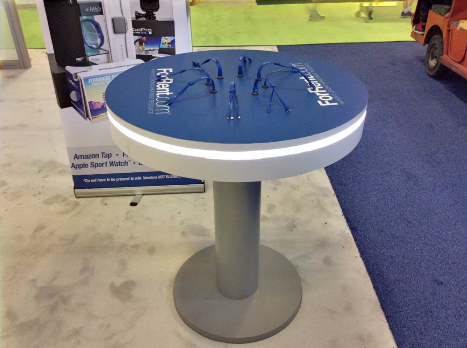 RENTAL: RE-1235 Half Circle Counter/Bar, RE-708 Charging Station Table, Sintra Infill Graphics for Counter, and Top Surface Vinyl Graphic for Charging Table