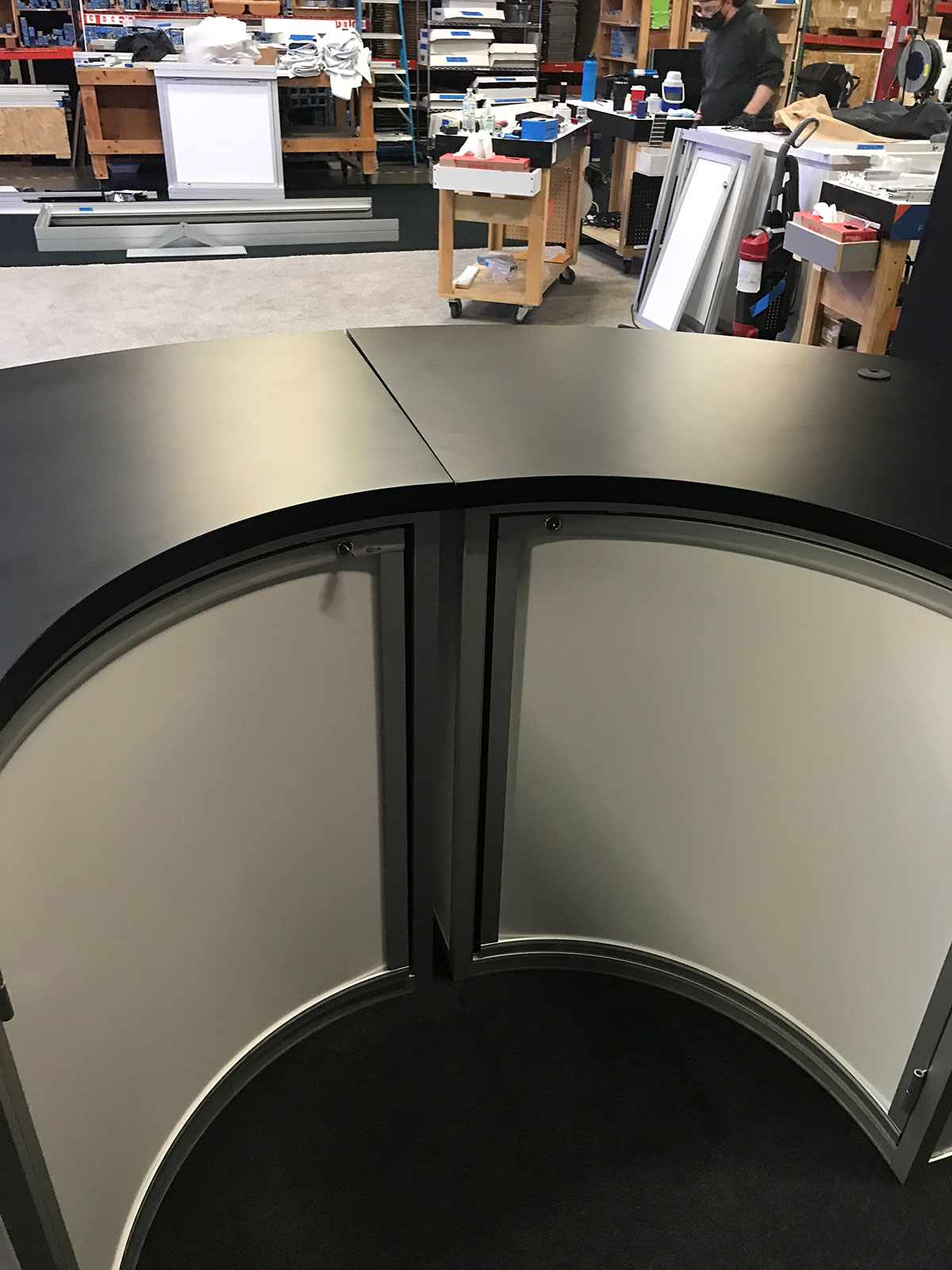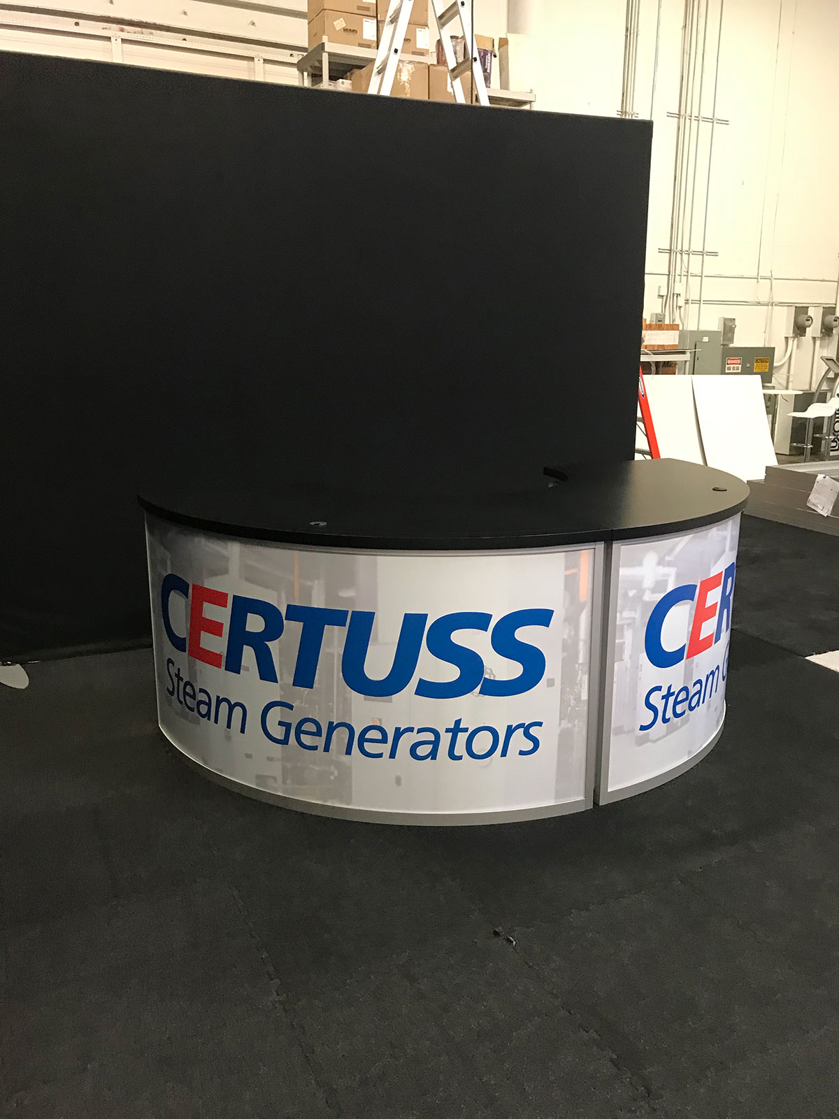 RENTAL: RE-1235 Half Circle Bar, RE-1202 Rectangular Counter with Direct Print Sintra Graphics. Trade Show Rental Counter Photos -- View 2 Trade Show Rental Counter Photos -- View 3 Trade Show Rental Counter Photos -- View 4 Trade Show Rental Counter Photos -- View 5