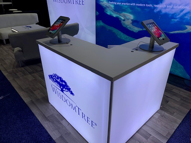 RENTAL: (2) RE-702 Charging Station Tables with Adhesive Graphics, (2) RE-1243 Rotating iPad Counter Stands, (1) RE-239 iPad Kiosk, (1) RE-1221 Curved Pedestal with Sintra Infill Graphic