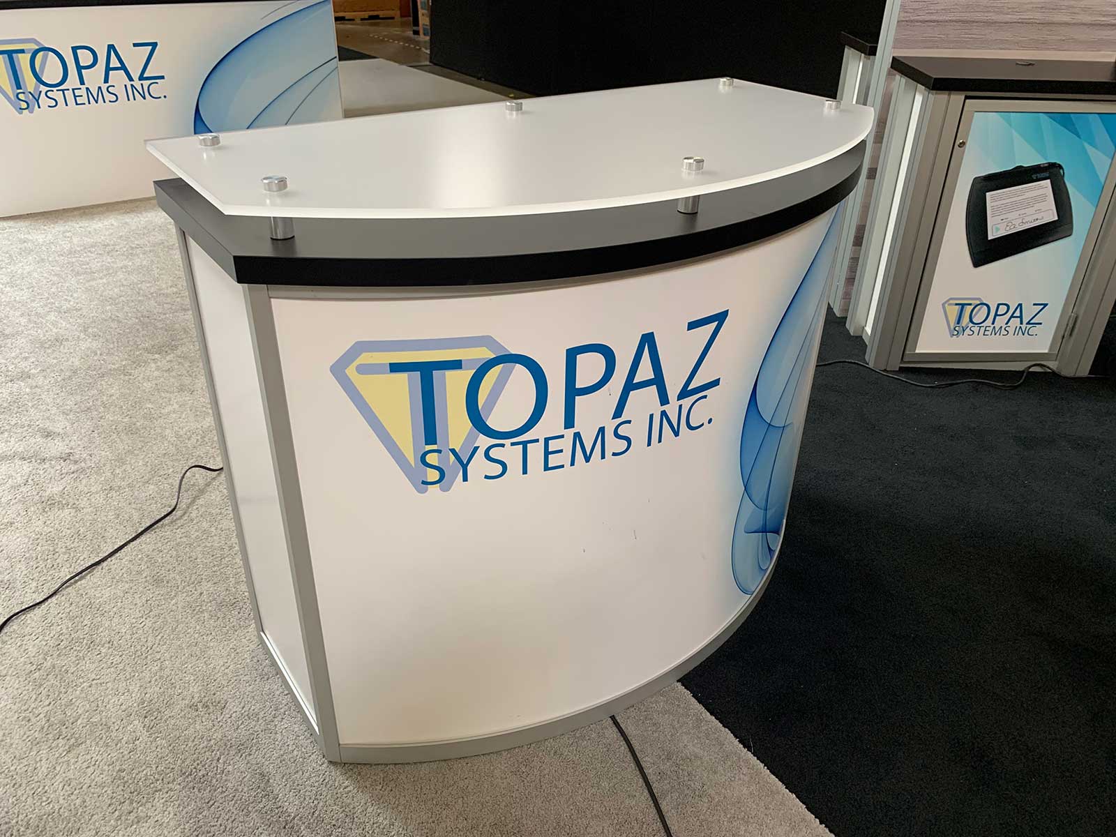 Backlit Exhibit with Tension Fabric Graphics, Backwall Counter with