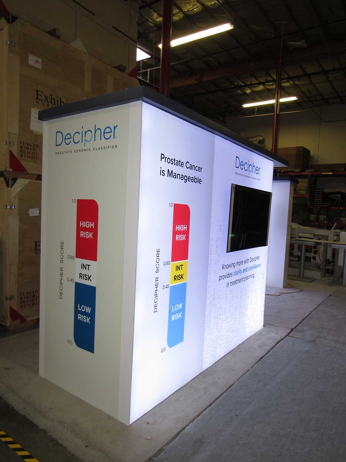 Modified VK-2984 Inline Lighboxes with Fabric Graphics, Full-size Closet, Literature Holders, Monitor Mounts, Backwall Counters, and MOD-1456 Charging Table Modified VK-2984 Inline Lighboxes with Fabric Graphics, Full-size Closet, Literature Holders, Monitor Mounts, Backwall Counters, and MOD-1456 Charging Table