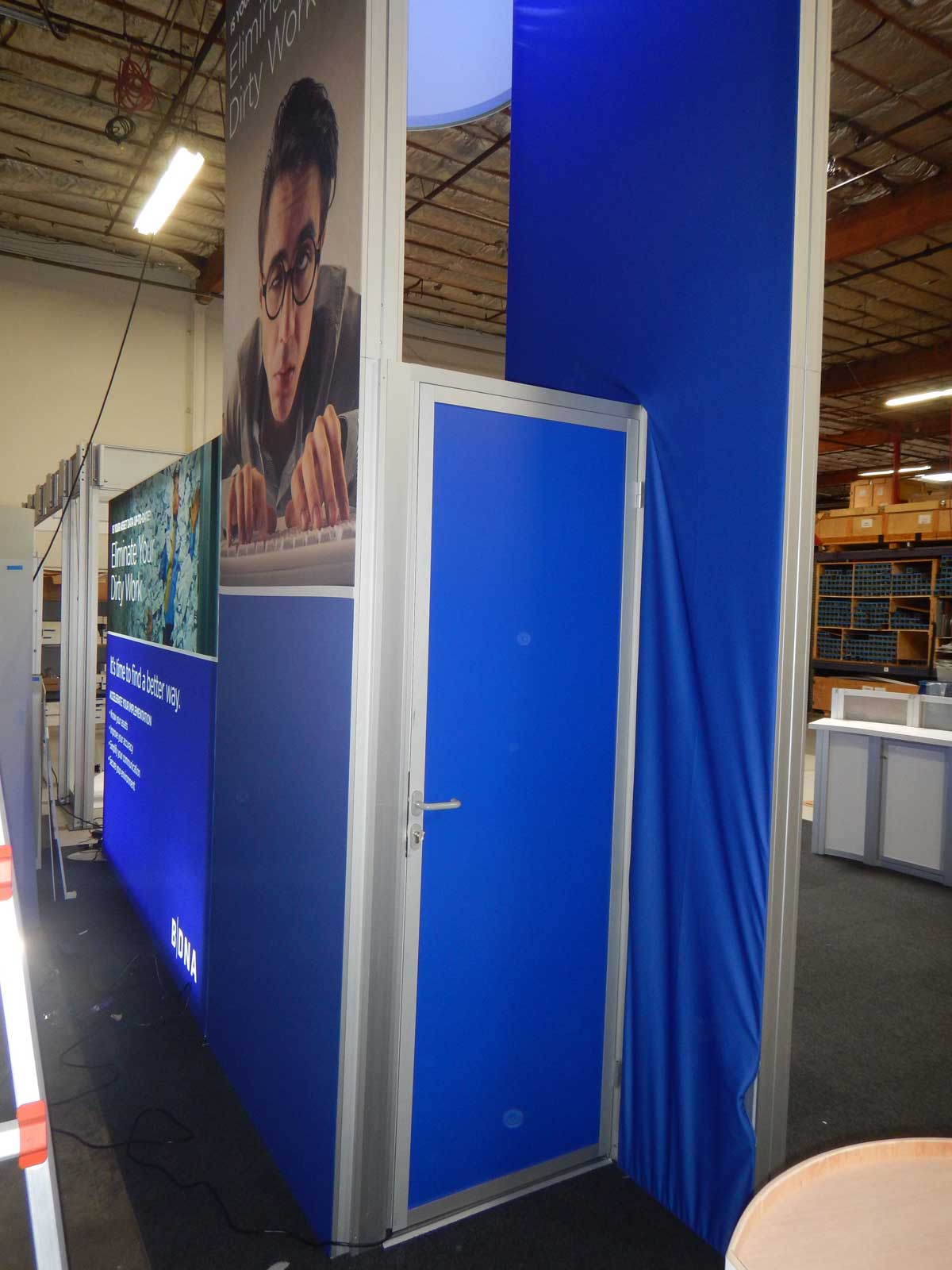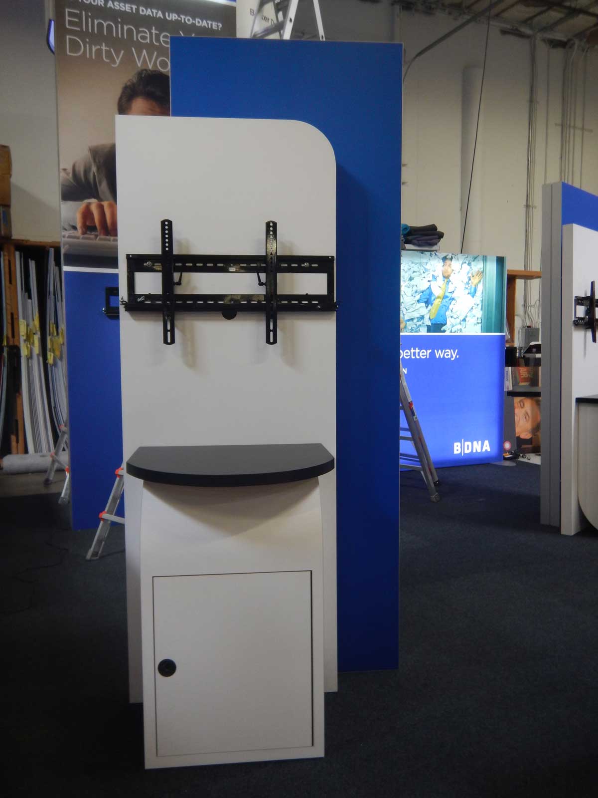 RENTAL: Modified RE-9080 Island with 16' High Tower and with SEG Backlit Graphics RENTAL:  Custom Kiosks with Locking Doors and Large Monitor Mounts RENTAL: Modified RE-9080 Island with 16' High Tower and Storage Closet with Locking Door RENTAL: Reception Counter with Locking Storage