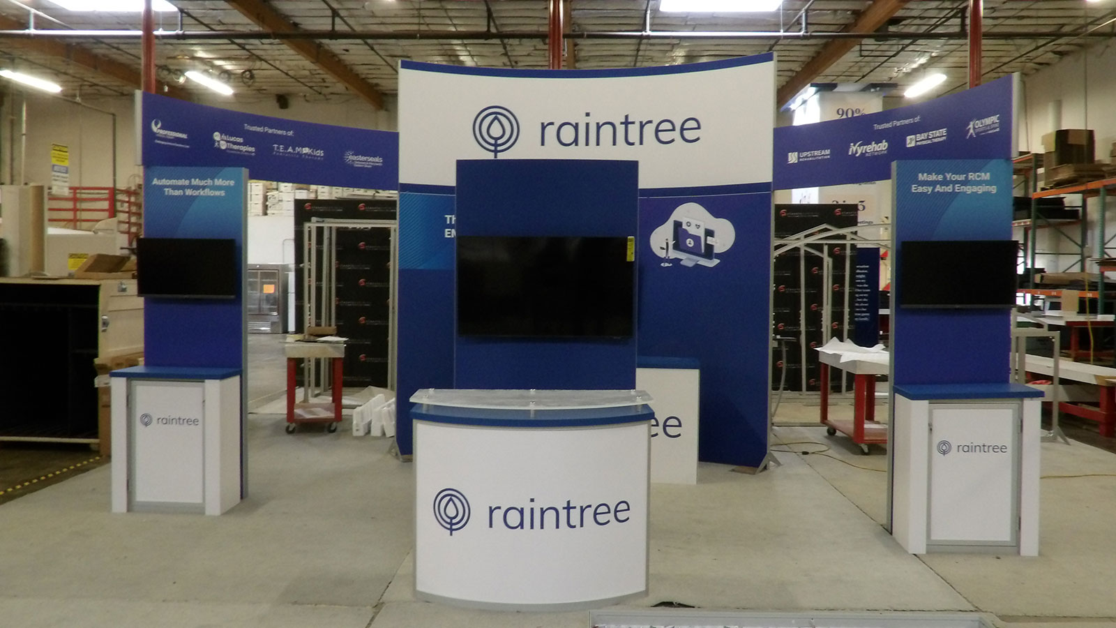 RENTAL: Modified RE-9119 Island Design with 12 ft. High Tower, (2) Workstation Kiosks with RE-1227 Small Rectangular Counters, (1) RE-1250 Reception Counter, RE-1207 Large Rectangular Counter, (1) Large Monitor Mount, (2) Medium Monitor Mounts, (3) Monitors, (4) LED Arm Lights, SEG Fabric Graphics, and Direct Print Sintra Graphics.