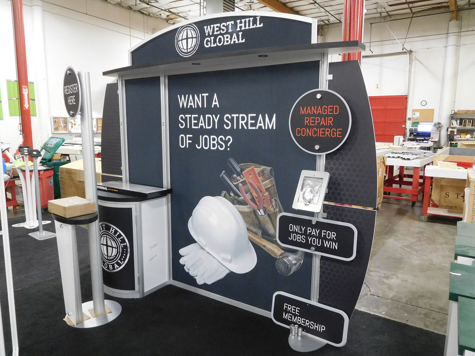 Modified VK-1321 Visionary Designs Hybrid Exhibit with Metal Canopy, Fabric Graphics, Workstation, and Monitor Mount