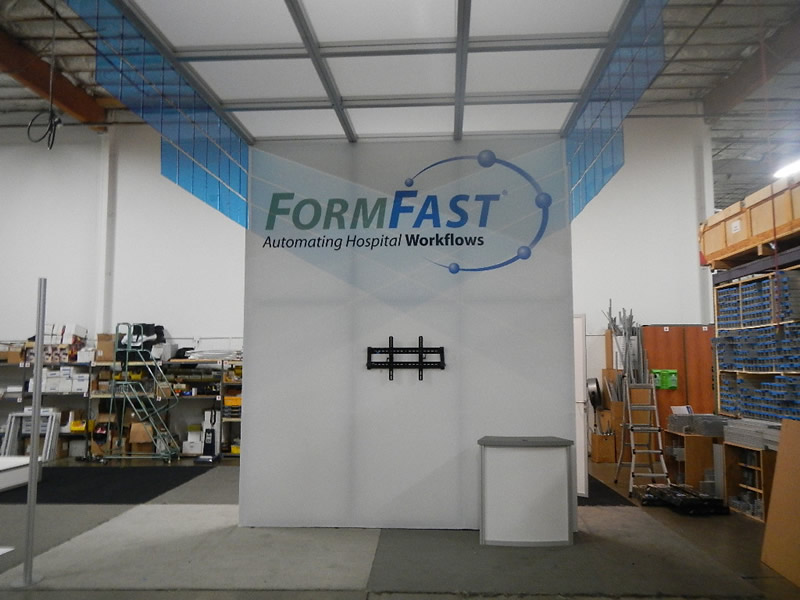 RENTAL: Island Rental with 14 ft. Tower, Lounge, Large Format Graphics, RE-1228 Curved Counter, RE-1219 Square Pedestal, and Blue Acrylic Accent Tiles and Infill Panels.