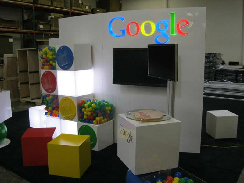 Eco-systems Sustainable Custom Exhibit for Google with Backlit LED Header, Walk-in Storage, and Custom Workstations [Eco-systems]