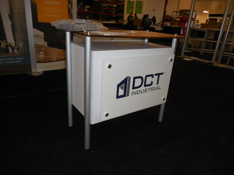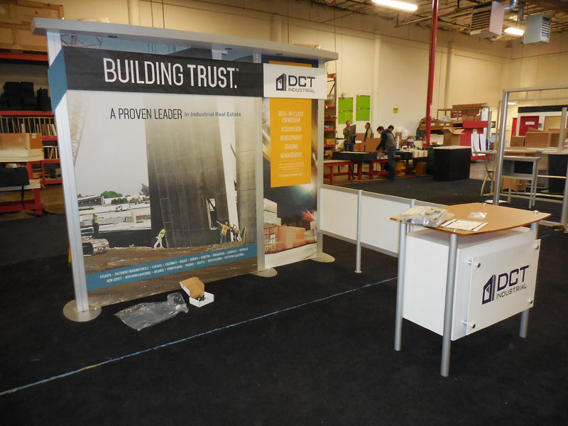 Modified VK-1044 Visionary Designs Hybrid Exhibit with Reception Counter, Pony Wall, and Large Tension Fabric Graphics -- Image 1 Modified VK-1044 Visionary Designs Hybrid Exhibit with Reception Counter, Pony Wall, and Large Tension Fabric Graphics -- Image 2 Modified VK-1044 Visionary Designs Hybrid Exhibit with Reception Counter, Pony Wall, and Large Tension Fabric Graphics -- Image 3