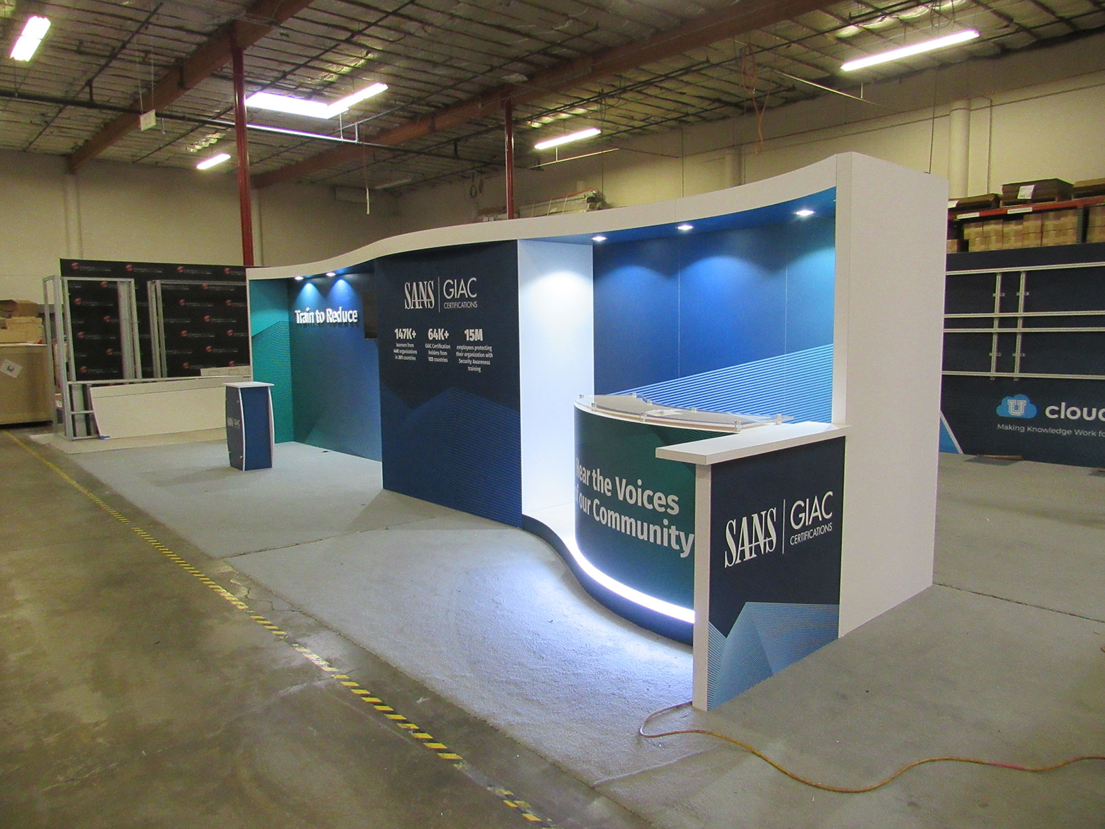 Custom 10 x 30 Inline Exhibit with LED Puck Lights, Raised Platform, Custom Counter, Closet Storage, Monitor Mount, and SYM-408 Counter with Locking Storage [58542]