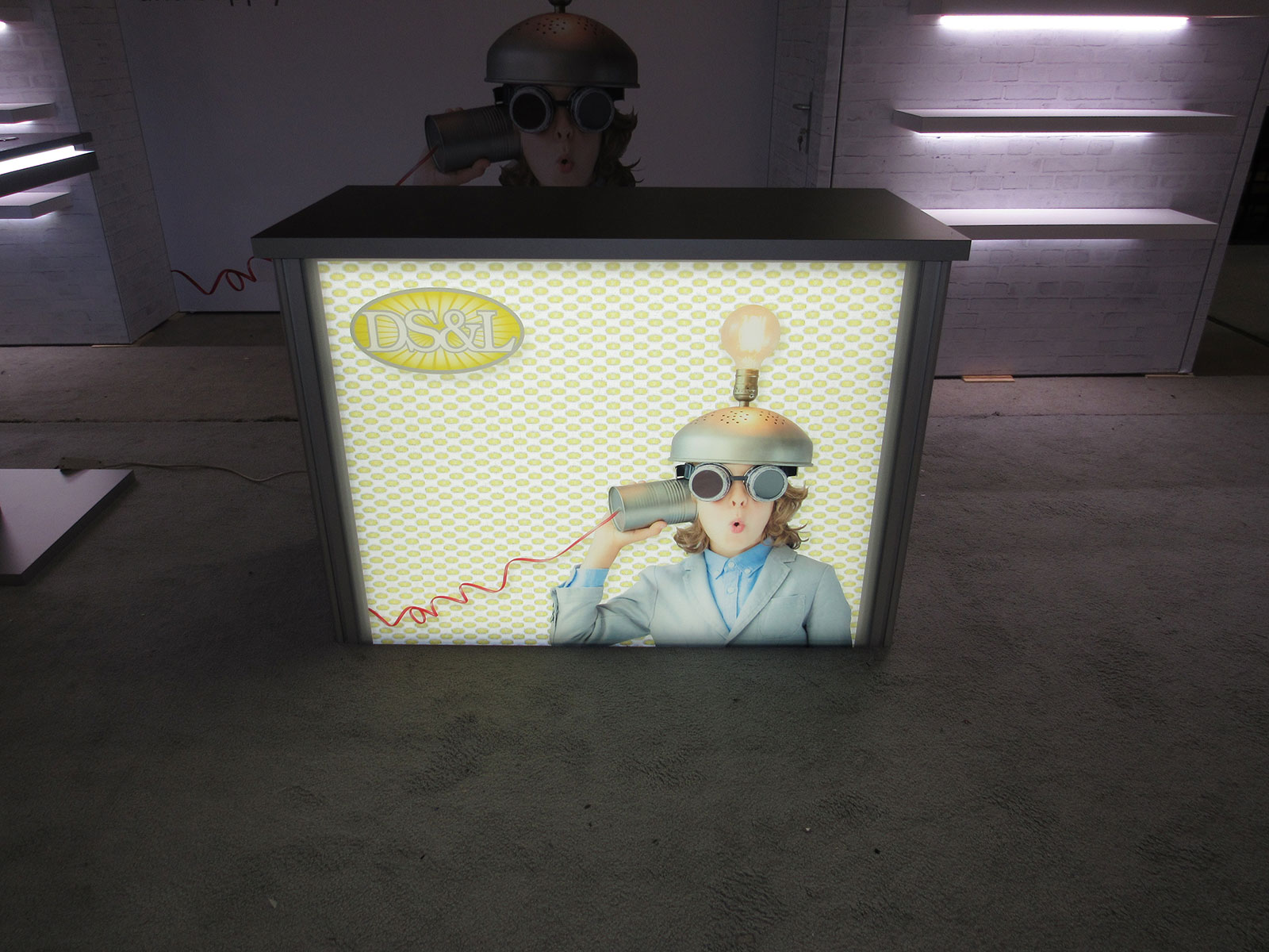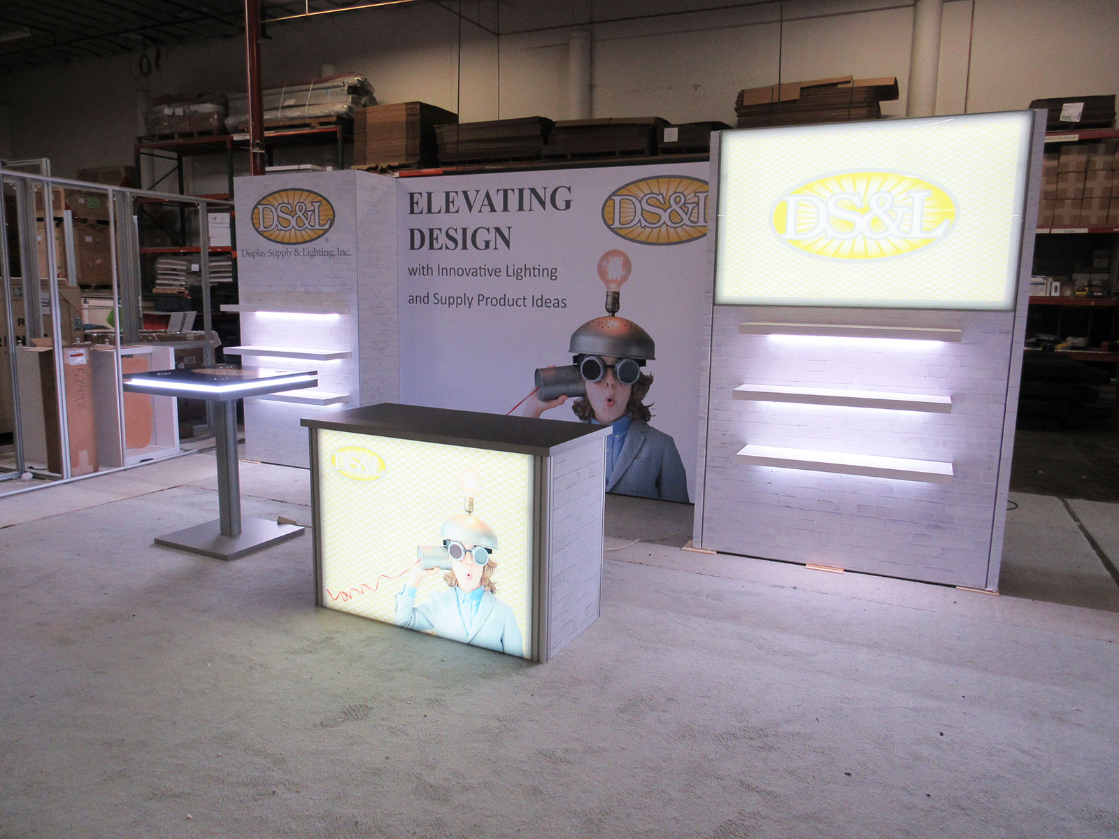 Custom Gravitee Modular Inline Exhibit with SEG Fabric Graphics, LED Lightbox, Closet Storage, Backlit Gravitee Counter with Storage, and MOD-1454 Wireless Charging Table Custom Gravitee Modular Inline Exhibit -- View 2 Custom Gravitee Modular Inline Exhibit -- View 3