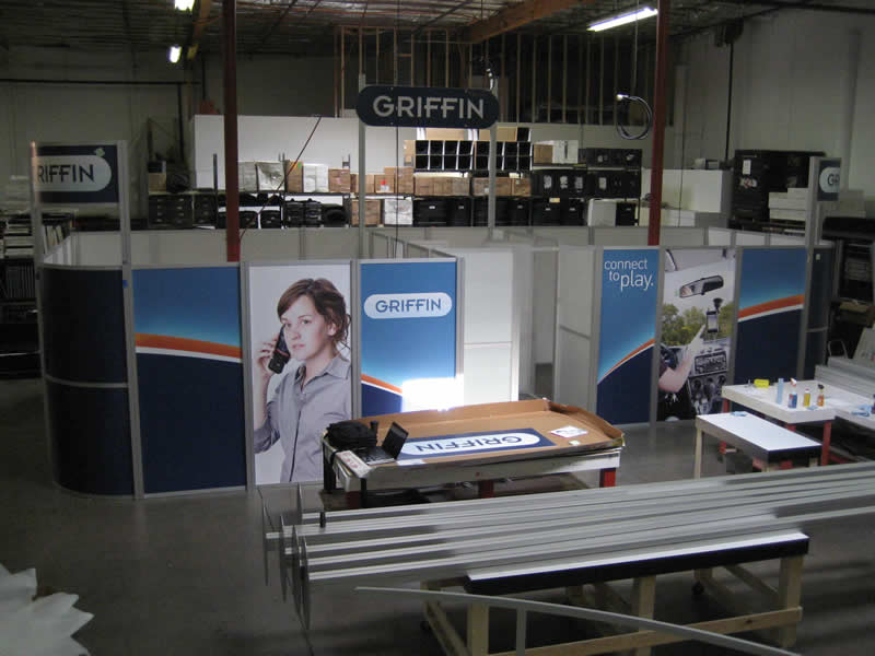 RENTAL Exhibit -- 20� x 40� Island with Large Conference Rooms, 12� High Graphic Tower. Shown during Preliminary Setup