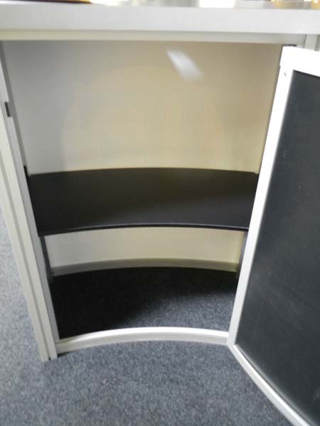 RENTAL: RE-1015 with SEG Fabric Graphic. Includes RE-1228 Small Curved Counter with Locking Door & Interior Shelf, and Front Sintra Infill Graphic