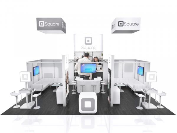Gravitee One-Step Modular System FeaturesAt every trade show, there's always one exhibit with an inviting vibe -- "Welcome. Relax. Spend some time away from all the chaos." The GK-5050 (RE-9130) is that booth. It blends large format backlit graphics and frosted acrylics into a casual space that includes multiple casual meeting areas. There are semi-private rooms with monitors and casual furniture, a large reception desk, and multiple charging stations to entice attendees. The overhead hanging signs make a statement in the exhibit hall, drawing attention and a crowd to the island exhibit. The GK-5050 is both a dramatic statement and a practical exhibit, perfect for any company that wants their trade show investment to create sales.