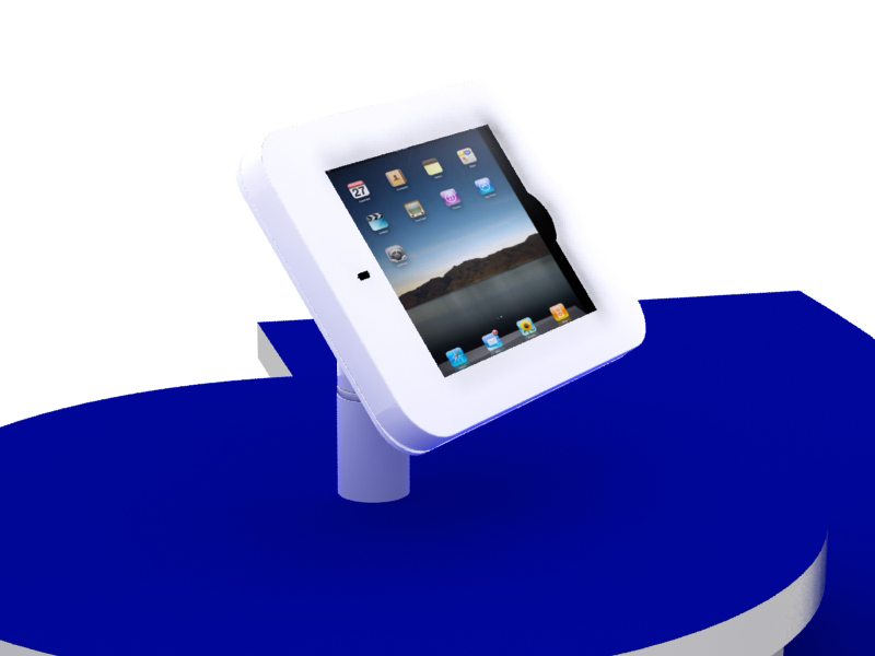 Adding an iPad to a counter, pedestal or workstation has never been easier. The MOD-1329 mounts on over 300 standard counters and workstations. The rotating clamshell frame swivels between portrait and landscape, and has two anti-theft locks. Choose from three durable powder-coat color options: silver, black, or white. There's even the option of graphics with a face plate or a rear halo to personalize your iPad.