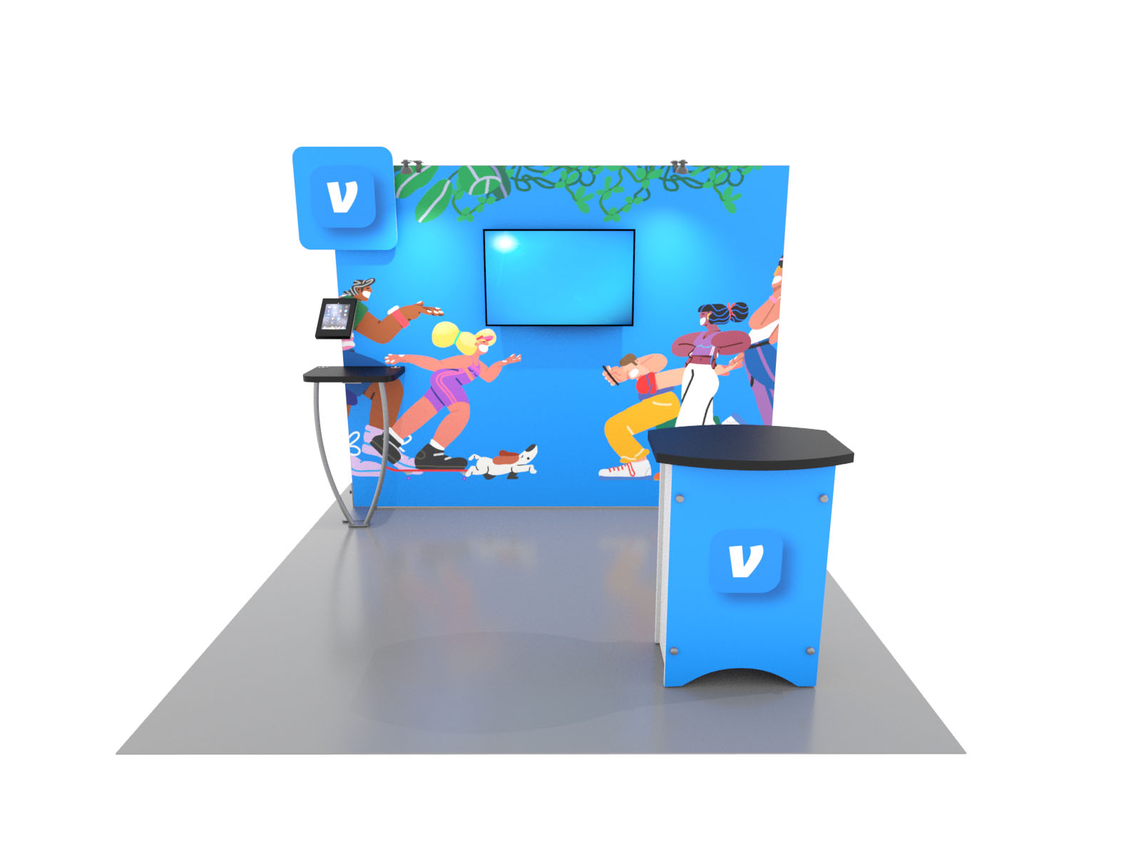 Personalize your Symphony Display with attractive counters, workstations, floating graphics, iPad clamshells, and monitor mounts. The lightweight aluminum frames are engineered for SEG dye-sublimated fabric graphics for a seamless, wrinkle-free look. Add floating graphics for additional visual layering and branding.