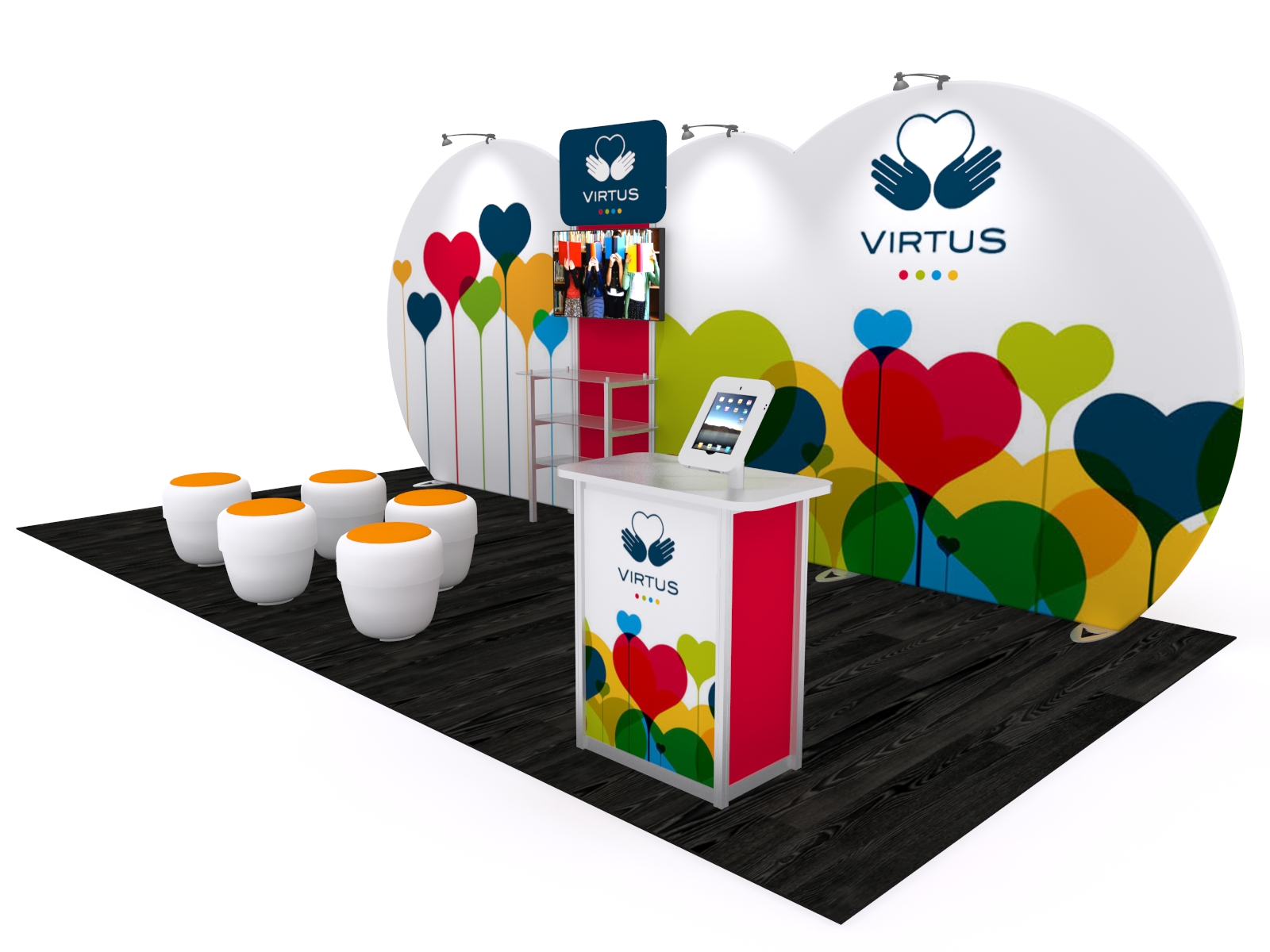 The Wow! Factor is often missing for most trade show exhibitors. They choose a safe display rather than one that's bold and distinctive. The TF-512 and TF-522 feature a flowing, powerful visual design with practical features like a large monitor, shelves, and locking storage. The MOD-1551 reception counter contributes to the graphic messaging and offers a convenient swivel iPad or Surface Tablet Mount. Add furniture for seating or meeting areas to complete the "meet and greet" mission of your trade show. And because the displays are re-configurable, you can switch between a 10 ft. or 20 ft. inline depending on your show.