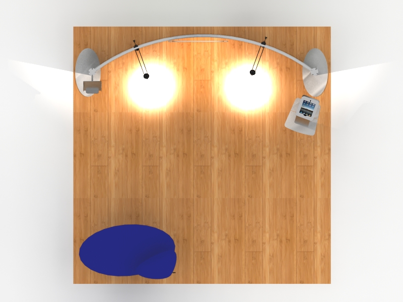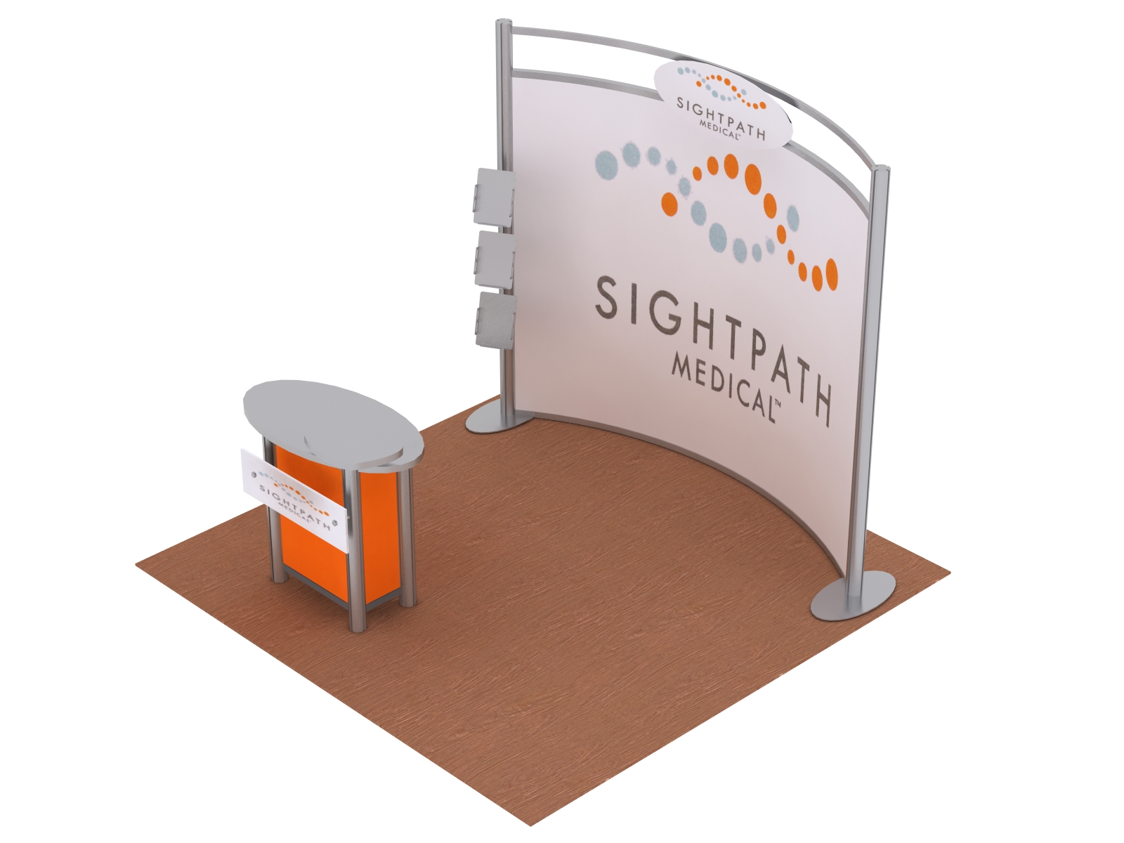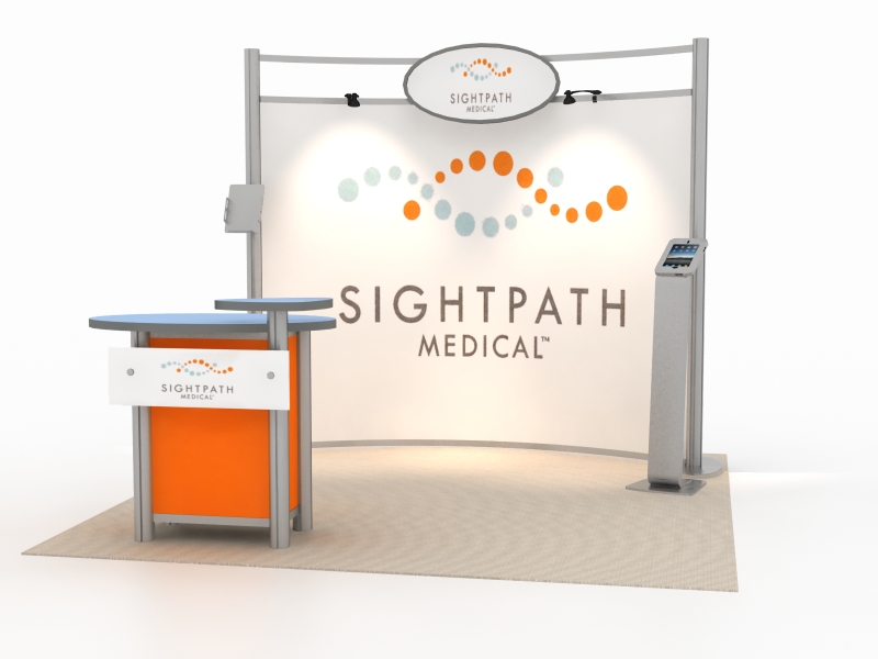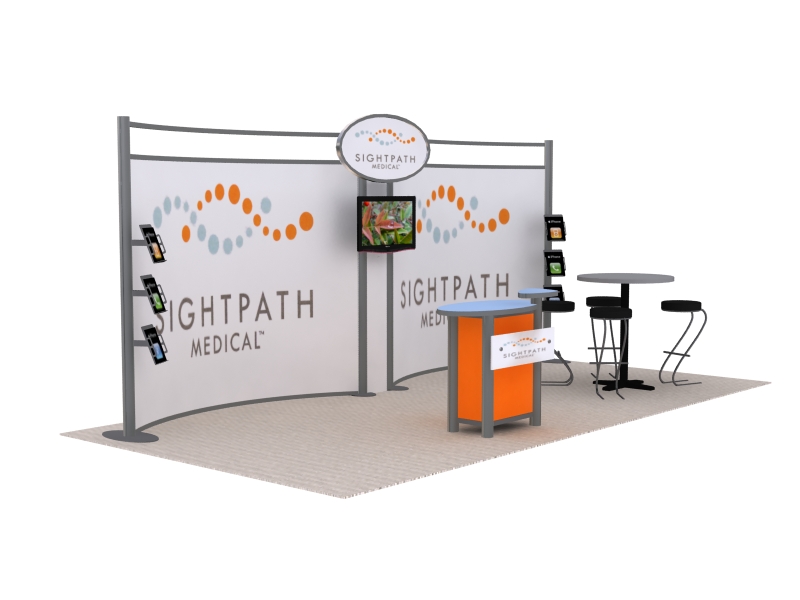 The lightweight, curved design of the VK-1104 is a familiar trade show shape but with multiple bonuses. First, the VK-1104 is built with MODUL engineered aluminum. That's important for two reasons: 1) Adding components or expanding to a 20 ft. inline is a snap, and 2) The aluminum components are built to withstand the most grueling tradeshow schedule and look beautiful year after year. Second, the large backwall graphic is tension fabric, an ideal lightweight material that packs small but shows big. Third, the MOD-1184 pedestal is both functional and good looking. And finally, the MOD-1312 Tablet Kiosk adds multimedia to your display without having to lug around a large monitor.