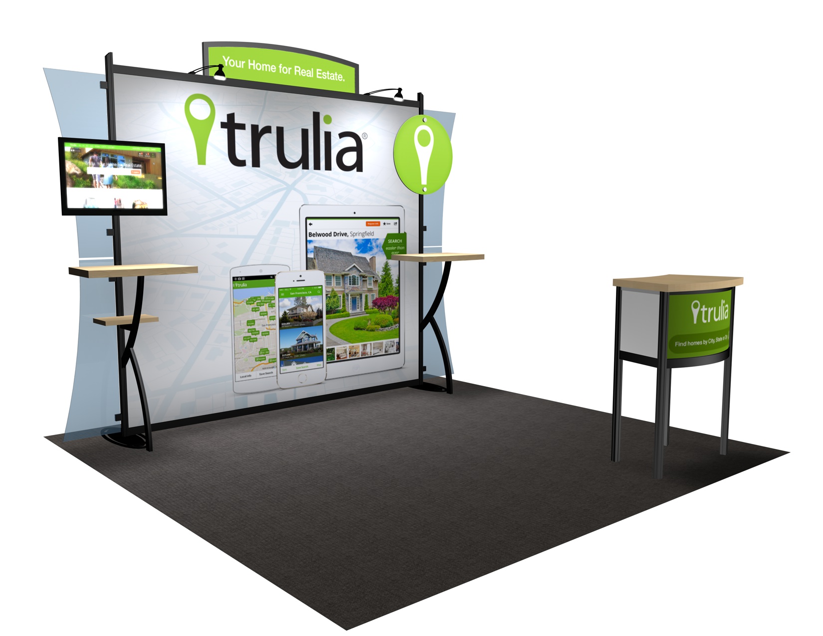 The affordable Sacagawea Portable Hybrid is a contemporary display designed with lightweight engineered aluminum and vibrant tension fabric graphics. Using knob-assisted assembly, the Sacagawea sets-up quickly, typically in less than 40 minutes for a 10 ft. display. All components are individually numbered and pack in durable roto-molded cases with custom die-cut foam packaging. Options include workstations, pedestals, fabric canopies, headers, iPad accessories, and monitors.