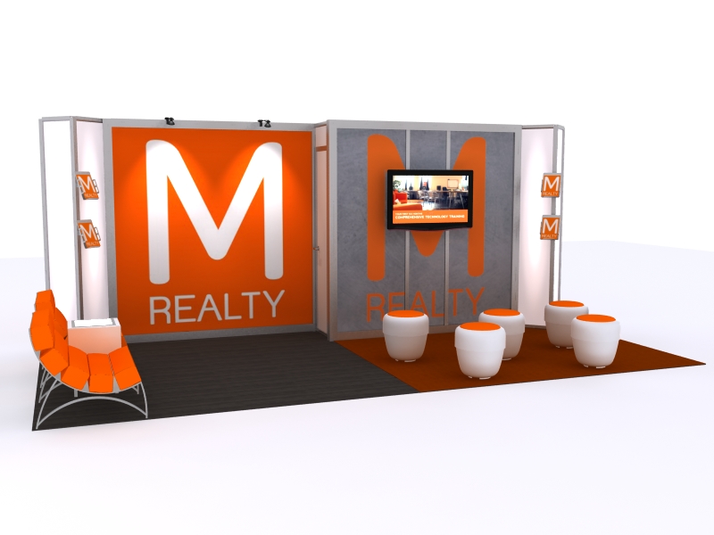 On its most basic level, a trade show display is a billboard featuring your product or service. The "M" series supercharges this idea by designing a graphic billboard with tension fabric, monitors, presentation areas, and a conference room. As your company grows and your tradeshow requirements expand, the "M" series makes it easy to evolve from a 10 ft. to a 20 ft. to an island display because the structure and the graphics are designed to be interchangeable. Add iPad kiosks or counters for additional flexibility and storage.