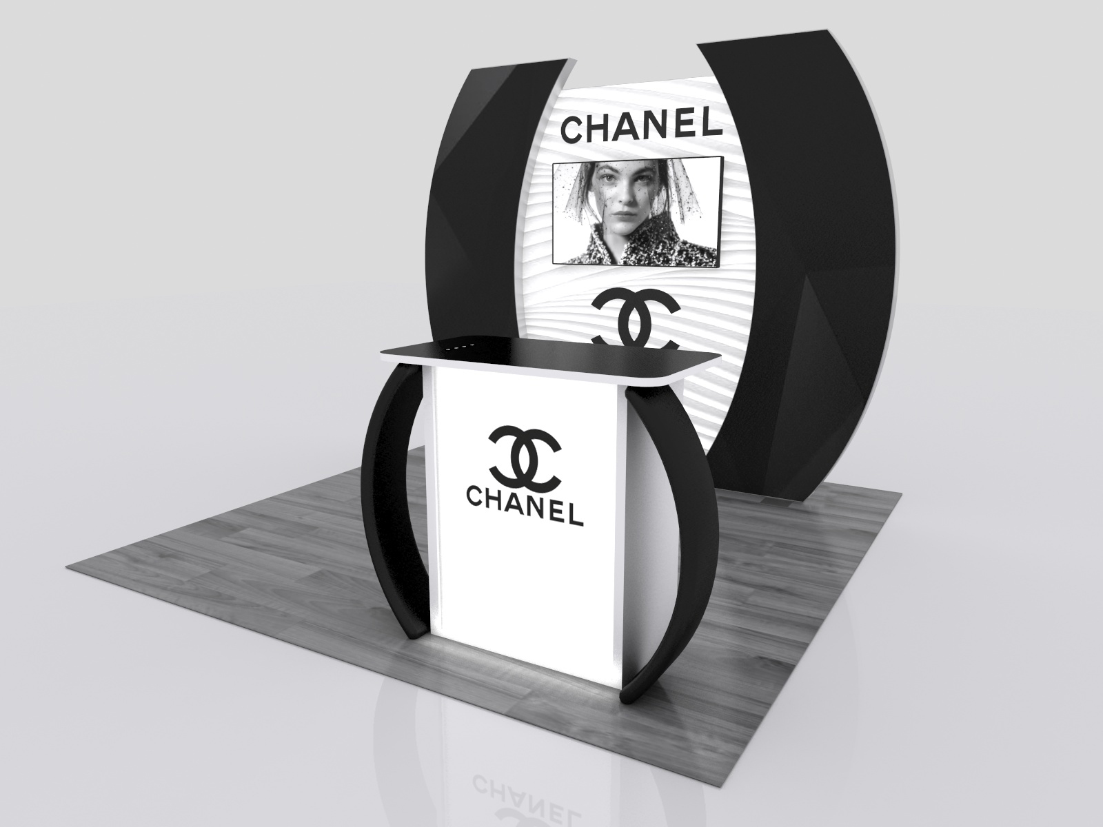The distinctive VK-1352 and VK-6000 lightboxes blend exceptionally bright LED lights, an aluminum SEG frame, and vibrant fabric graphics into a brilliant eye-catching display. The large LED lightbox spans the display and is framed with curved laminated panels. The middle section supports a large monitor and includes graphics for high impact. Upfront there's a modified MOD-1550 reception counter with a front backlit graphic and USB charging ports. On the far right are two product displays with uplighting for the 20 ft. display. All have integrated cord management. You won't believe your eyes the first time you flip the switch and see how stunning your backlit graphic can be.