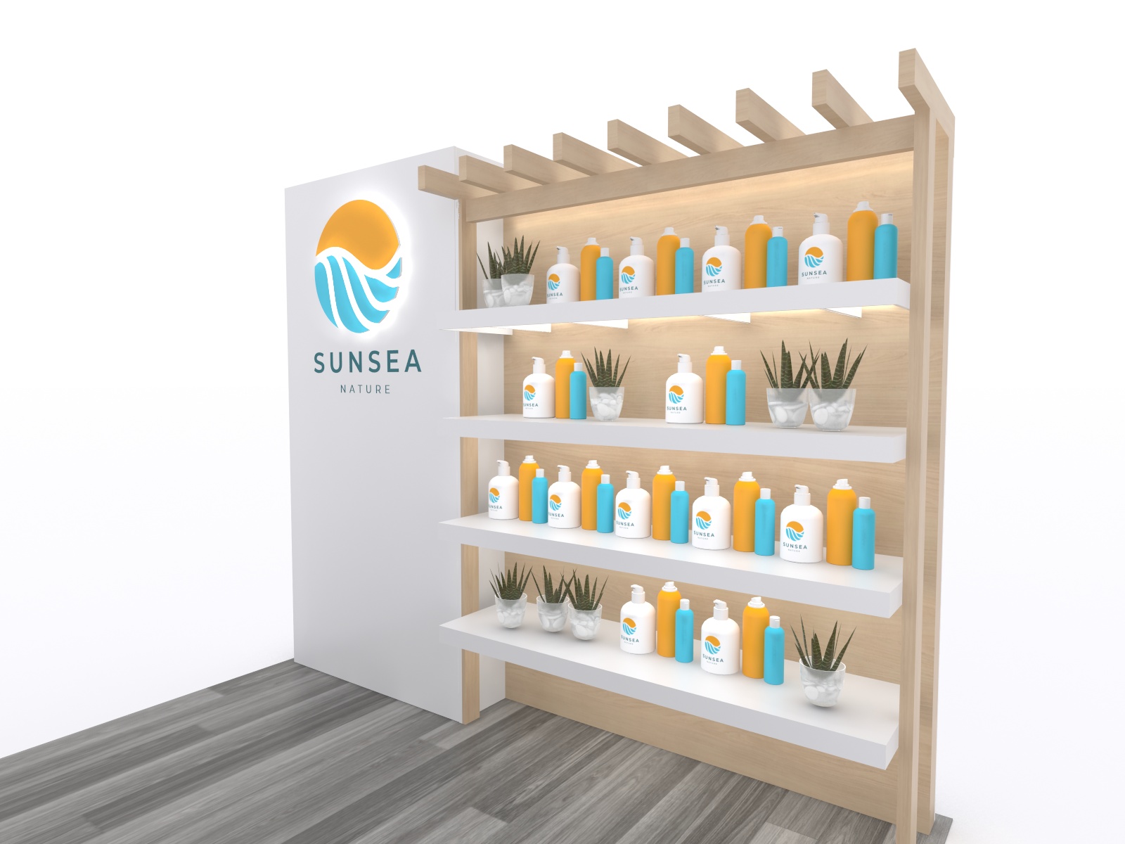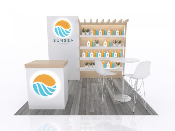 Practical and dramatic are not mutually exclusive. The VK-1359 perfectly blends dramatic 3D LED lighting, a stunning pergola design, and practical shelving. The 3D logos feature LED halo lighting to attract attention. The full-assembled custom counter has an internal shelf and a locking door to secure valuable during the show. The 10 ft. design compact design has room for casual seating, like the bistro table and chairs shown in the rendering. All components pack in fabric-lined, jigged wood crates with reusable packaging