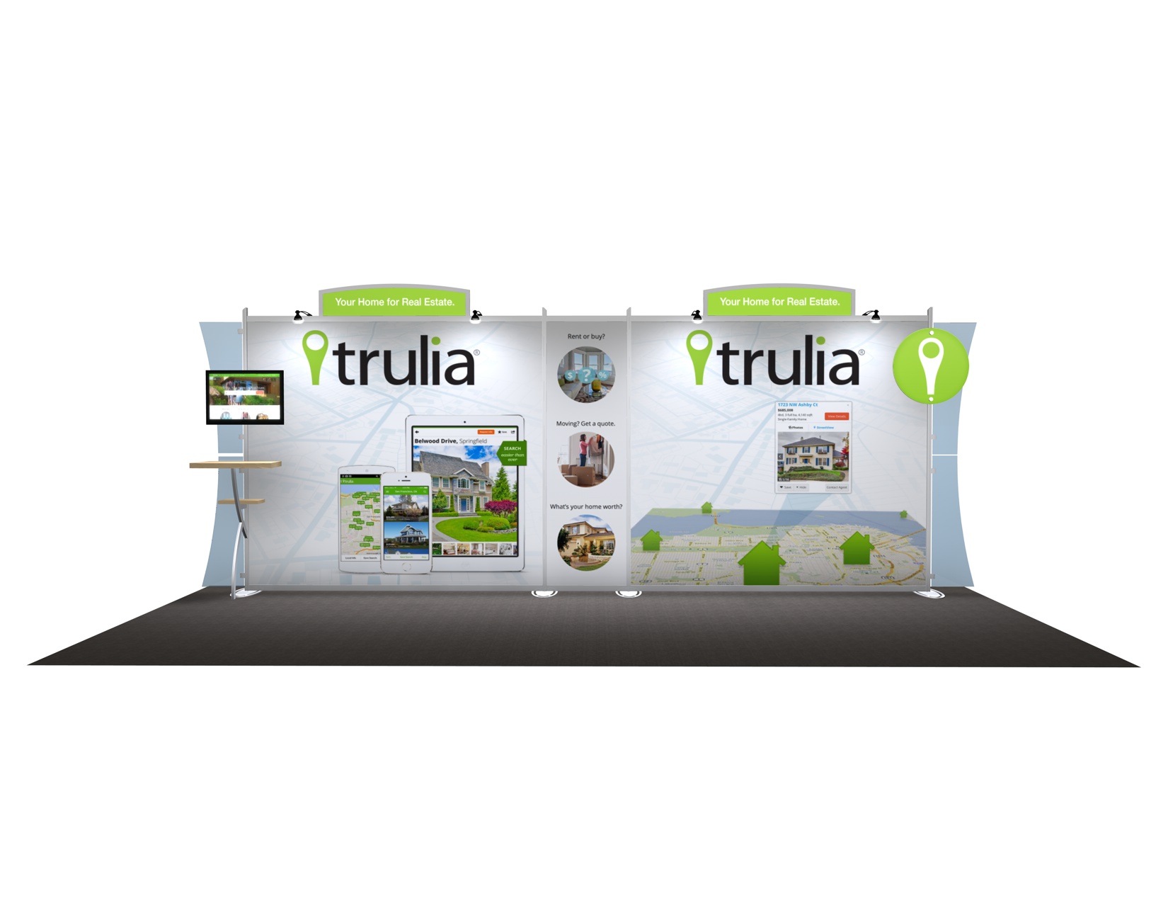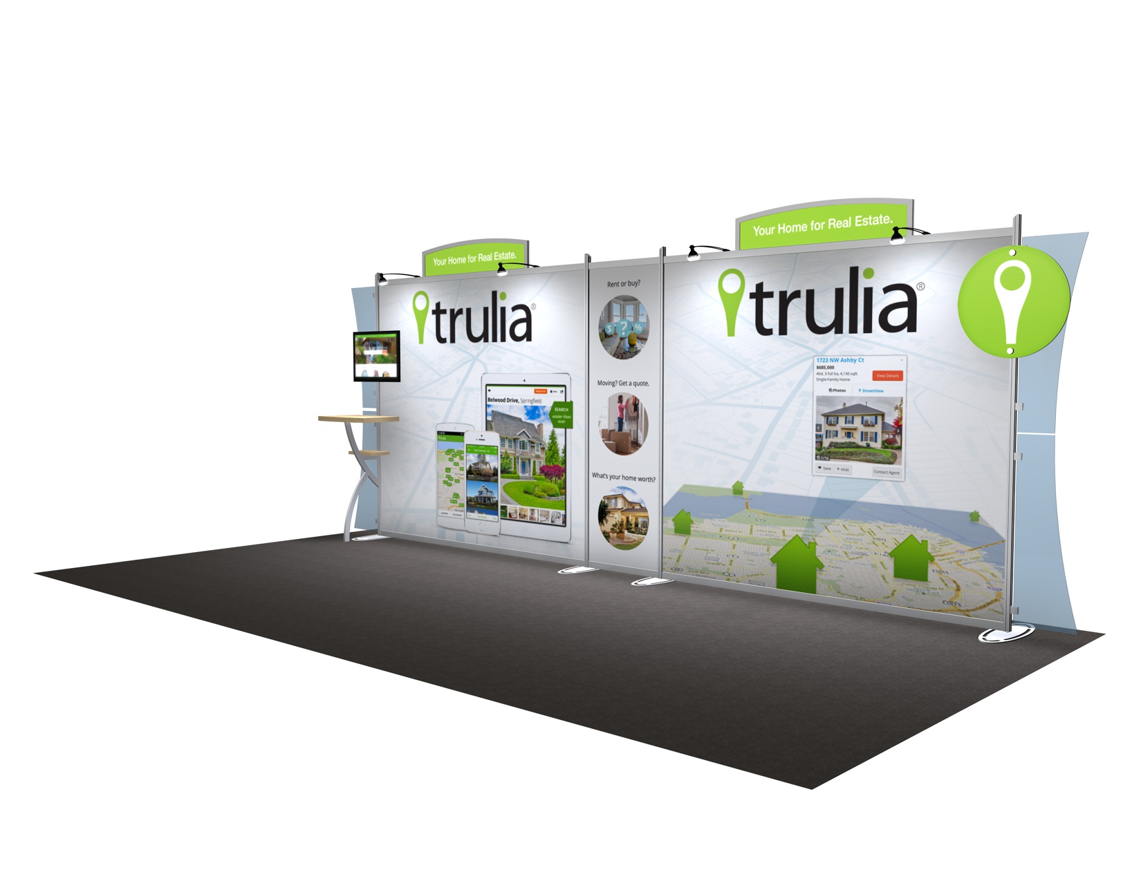 The affordable Sacagawea Portable Hybrid is a contemporary display designed with lightweight engineered aluminum and vibrant tension fabric graphics. Using knob-assisted assembly, the Sacagawea sets-up quickly, typically in less than 40 minutes for a 10 ft. display. All components are individually numbered and pack in durable roto-molded cases with custom die-cut foam packaging. Options include workstations, pedestals, fabric canopies, headers, iPad accessories, and monitors.