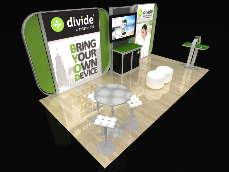 Hybrid is a relatively new category of trade show displays. Generally, hybrid displays incorporate aluminum extrusion, tension fabric, and other display components such as laminates, wood, Sintra, and other materials to create a tabletop, inline, or island exhibit.