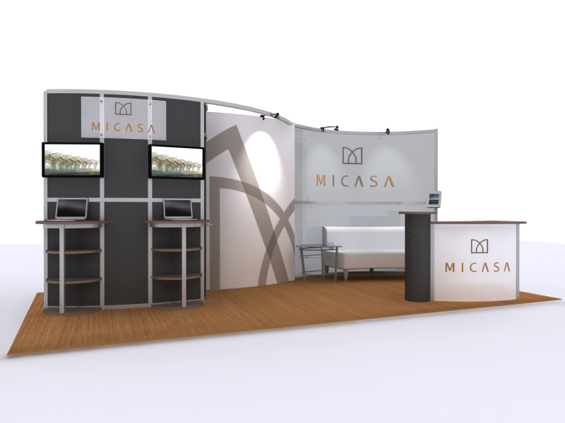 In a world of garish colors and impractical design, understated elegance stands apart in its ability to convey luxury. The "Micasa" exhibits transform simple curves into an inviting upscale setting with functional multimedia options. The exhibits include large monitor options, iPad presentations in locking clamshell frames, and presentation/lounge areas. The reception counter offers ample storage and large graphics in a sweeping design that invites tradeshow attendees into your booth. Best of all, as your trade show schedule changes, the "Micasa" exhibit expands or shrinks depending on your needs. These hybrid designs look expensive but are very affordable.