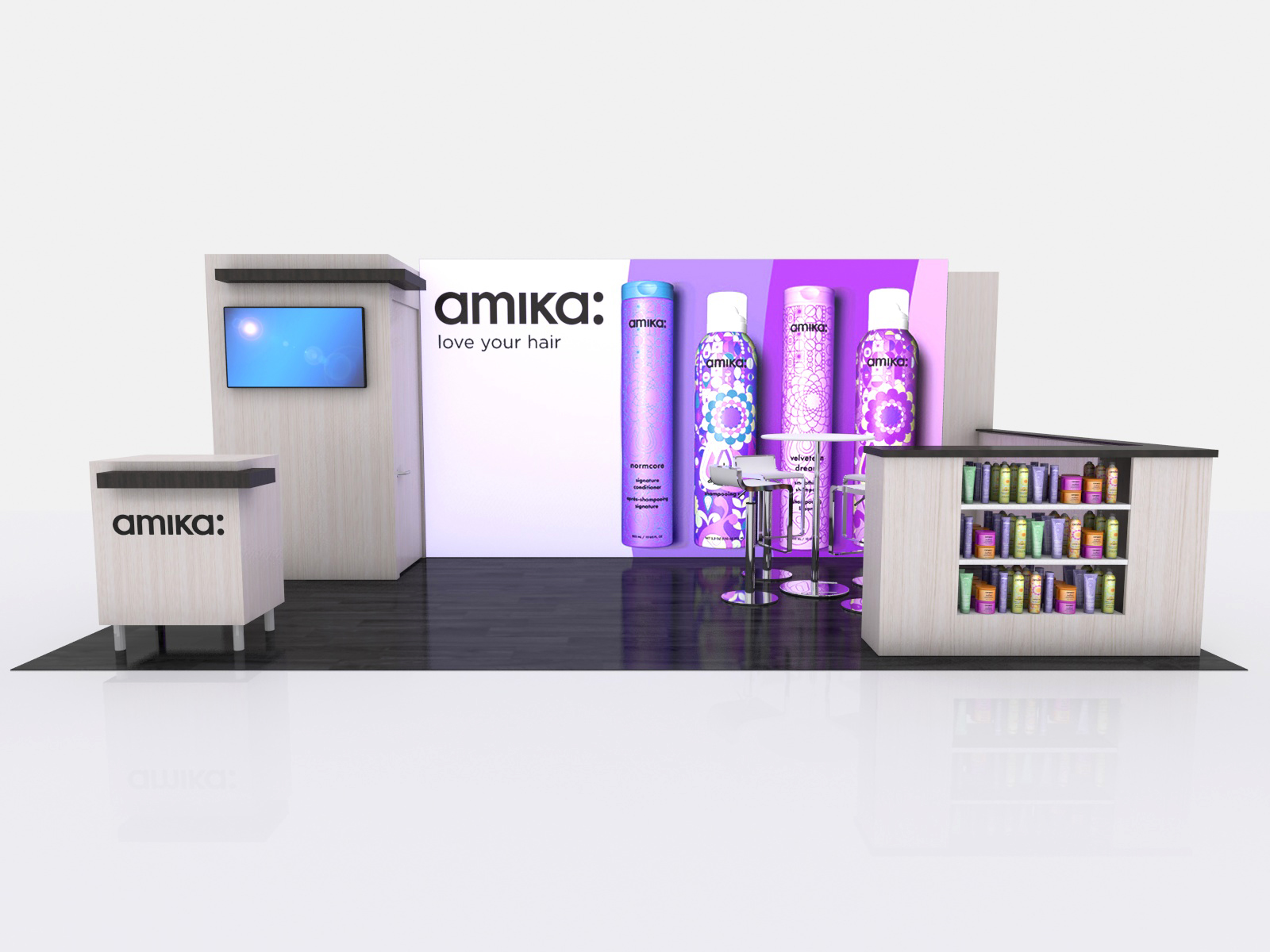 Make no mistake, it's all about the 14 ft. LED Lightbox with a fabric graphic. That's the single biggest attraction in the VK-4019. Once you have the tradeshow attendee's attention, it's time to get serious. The open floorplan allows for meeting space or product displays. The front shelving is great for product placement or as an attractive design feature. The inline exhibit includes a full-size closet for ample storage, and the custom reception counter has locking storage as well. The monitor option complements the large backlit graphic and can be used as an effective demo station for your online product reviews.
