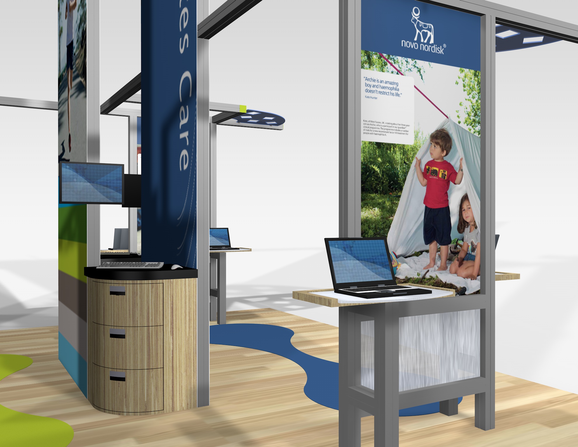 The four outlying structures present additional branding space, with two serving as workstation areas and the large monitors mounted to the remaining two structures. Additional architectural elements featured in the VK-5077 are extrusion caps color-matched to the tower canopy and (customizable) perforated acrylic accents mounted above each outlying structure.