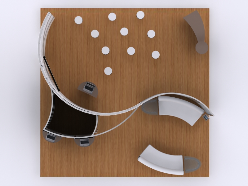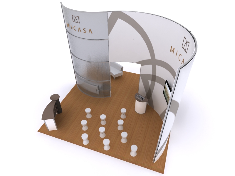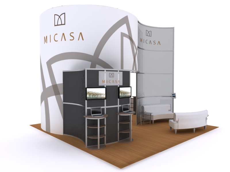 In a world of garish colors and impractical design, understated elegance stands apart in its ability to convey luxury. The "Micasa" exhibits transform simple curves into an inviting upscale setting with functional multimedia options. The exhibits include large monitor options, iPad presentations in locking clamshell frames, and presentation/lounge areas. The reception counter offers ample storage and large graphics in a sweeping design that invites tradeshow attendees into your booth. Best of all, as your trade show schedule changes, the "Micasa" exhibit expands or shrinks depending on your needs. These hybrid designs look expensive but are very affordable.