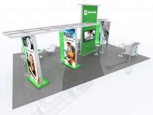 The VK-5089 and VK-5125 are inviting and comfortable island exhibits, which can be rare on trade show floors. They include large graphics, backlit and non-backlit, with an open floor plan that allows for easy access and a relaxed environment. The two large monitors attract attention while the seating areas encourage conversation. There's an attractive and functional reception counter, along with branded charging table options. The overhead canopies, with optional LED lighting, provide visual continuity and balance in this memorable island exhibit.