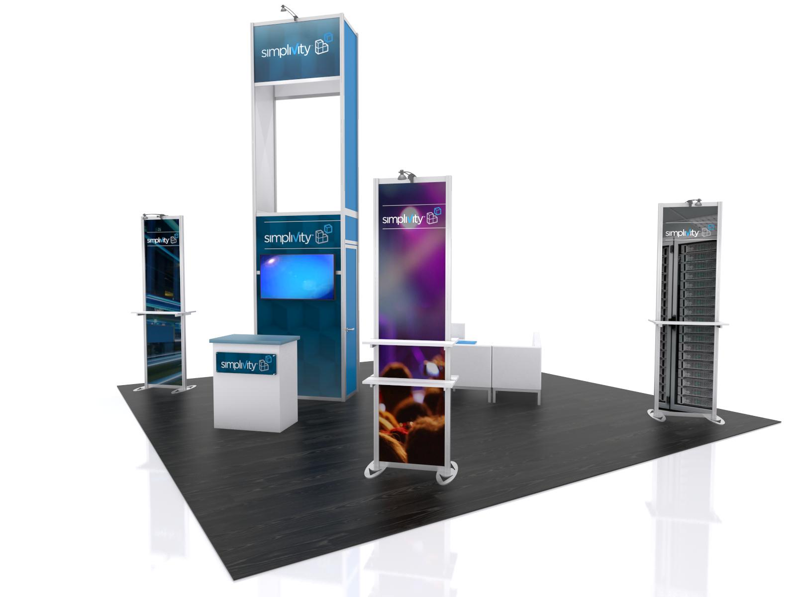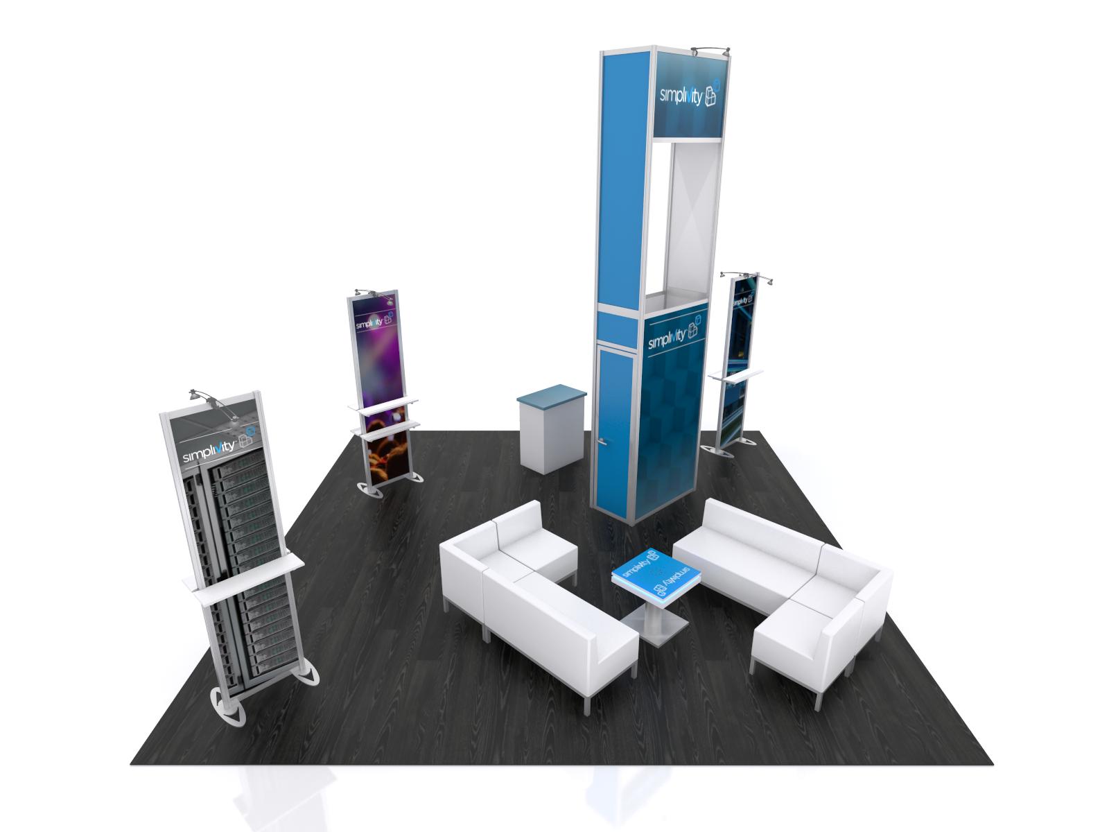 Exhibitors often use the phrase "Open and Airy" when describing their design requirements. It suggests a comfortable, open floorplan which still fulfills the goals of promoting the brand and meeting with show attendees. The VK-1332, VK-2976, and VK-5138 achieve those goals. The island has three two-sided graphic stands with product shelves and a large central tower. There's a walk-in closet for storage, which does double duty as monitor wall. The LTC-130 Counter creates a targeted spot for attendees to start their tour of the exhibit space. Once inside the booth, your guests can relax since there's ample room for furniture, whether you choose lounge chairs or tables and chairs.