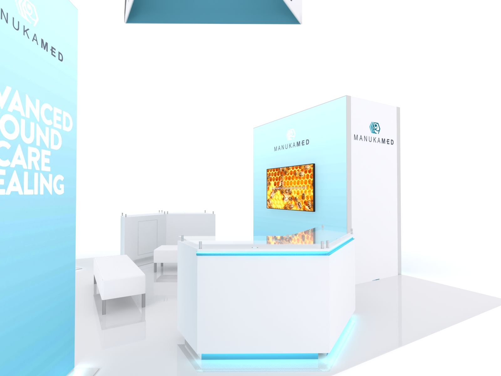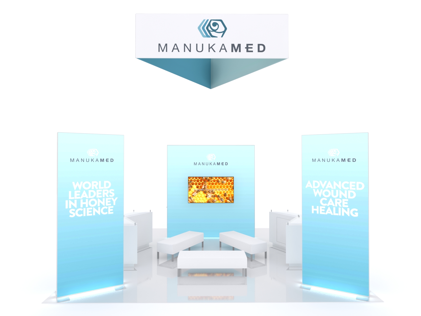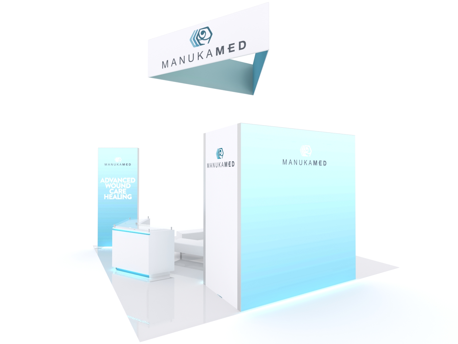 An island exhibit doesn't have to stand tall or be overly complicated. It simply has to fit your tradeshow marketing needs... and get noticed. The VK-5146 island has two eye-catching double-sided SuperNova lightboxes. These lightboxes assemble quickly and are always the star-attraction in any booth space. There are two elegant custom MOD-1557 counters. The VK-5146 has a large full-size closet along with storage in each reception counter. In addition, the closets do double duty, serving as lightboxes on the two longer sides and supporting a monitor in the lounge. High above, there's an Aero Triangle Hanging Sign so you're sure to attract attention from across the show hall.