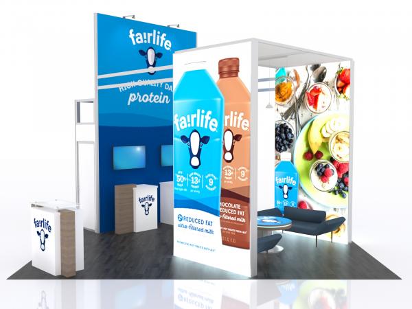 An Island Exhibit should attract attention. The VK-5147 and VK-5148 are designed for maximum exposure at your next show. It all starts with two 12 ft. double-sided SuperNova Lightboxes on either side of a casual meeting space. The meeting space includes a MOD-1430 Charging Station with LED perimeter lights and (8) USB ports. On the aisle, there are small custom reception counters with storage. Beneath the monitors are attractive workstation counters. No island would be complete without closet storage for products, giveaways, coats and briefcases, and cleaning supplies. Anchoring each island design is a 16 ft. double-sided tower with fabric graphics and downlighting.