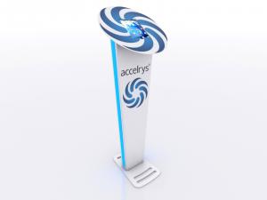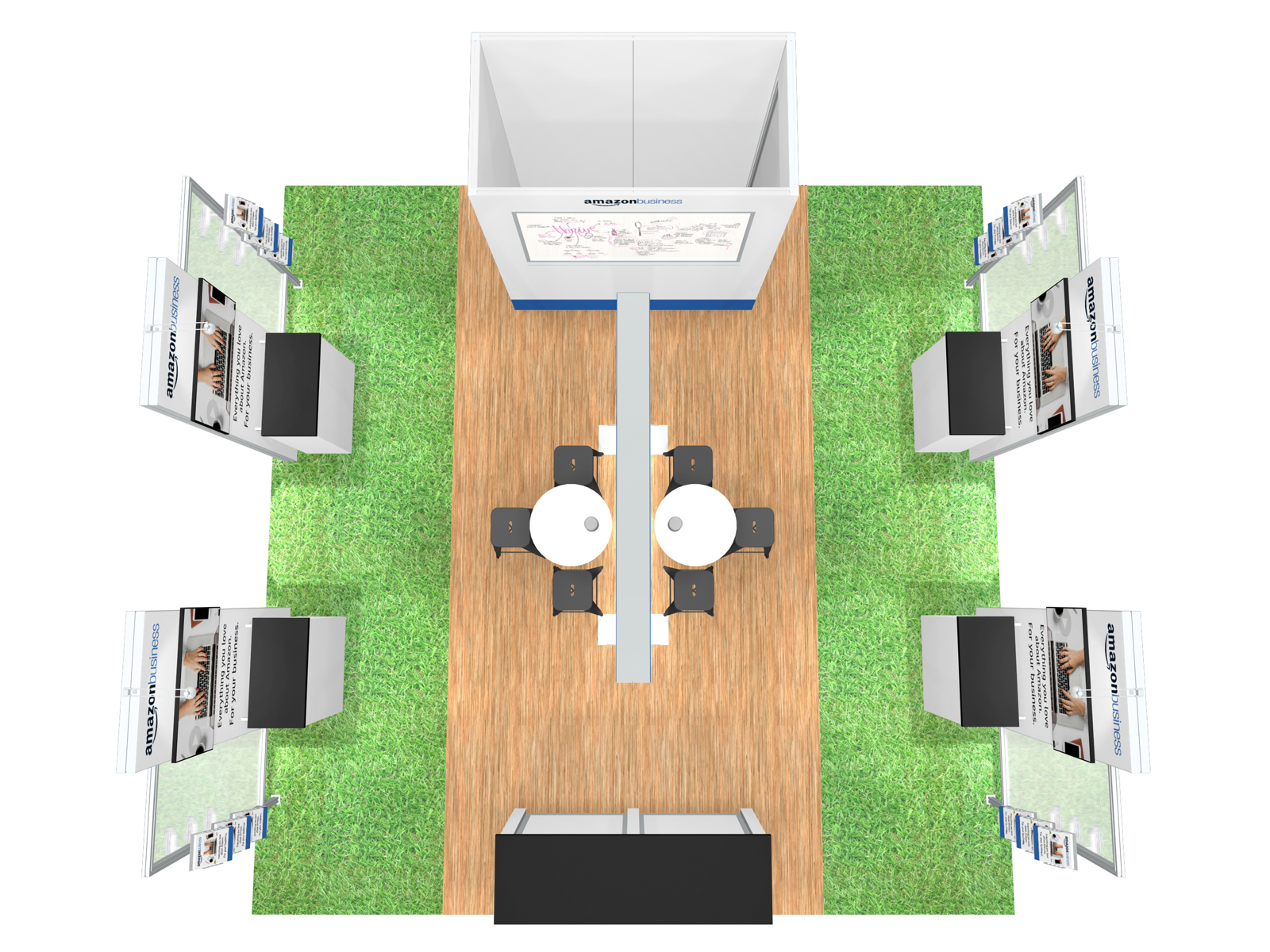 A well-designed rental island exhibit should be attractive, inviting, informative, and practical. The VK-5168 does all that... and more. It combines lightboxes and vibrant graphics with functional monitor kiosks in a booth design that welcomes business conversations and problem solving. There are multiple locking counters and a full-size closet for secure storage. The 12 ft. high central tower include meeting area. Finally a large square overhead hanging sign ensures visibility throughout the exhibit hall.