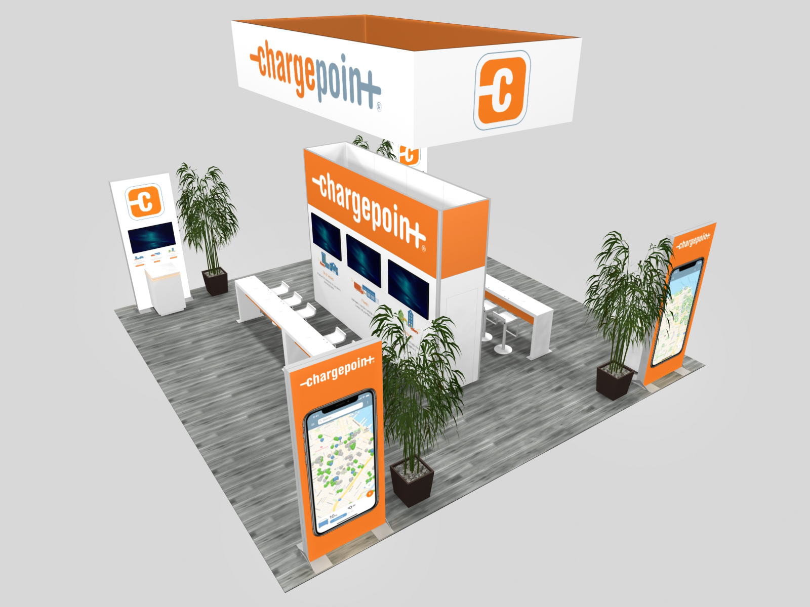 One BIG advantage of choosing a modular island exhibit is design flexibility. Even if your booth size remains the same from show to show. The VK-5176, VK-5174, and VK-5175 islands illustrate how the floorplan can change in a 30 x 30 space. Need a large closet (VK-5176) at one show but an open floorplan at another (VK-5174). How about a casual seating area (VK-5175)? All three designs are variations of a theme which include SuperNova lightboxes and a large Aero hanging sign for additional visibility. Plus, multiple genius bar counters for demos or intake meetings. Consider changing the graphics and rental furniture for even more design flexibility