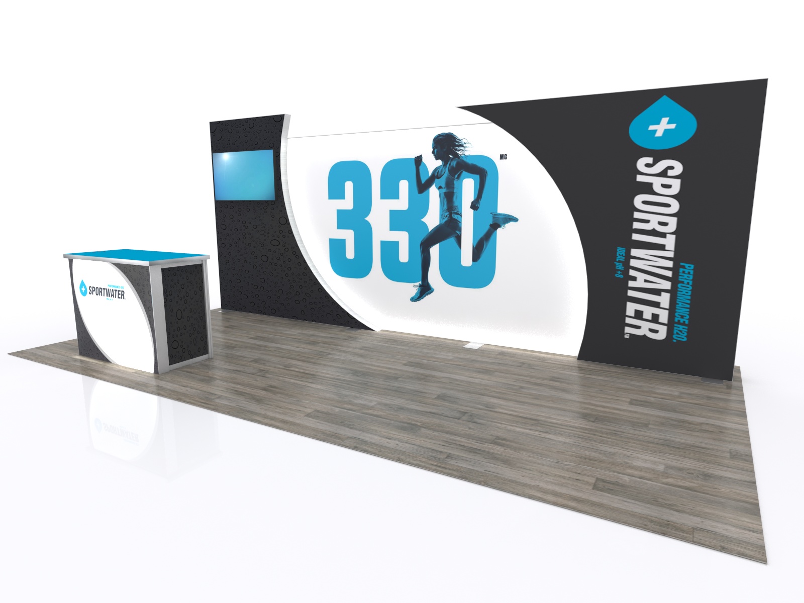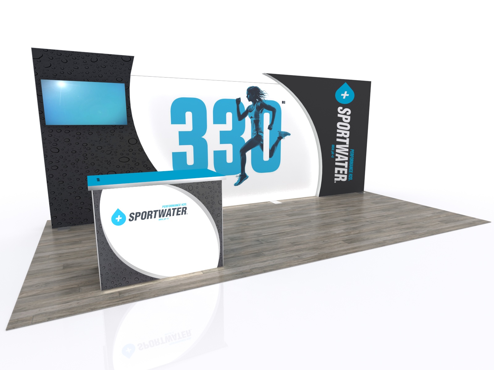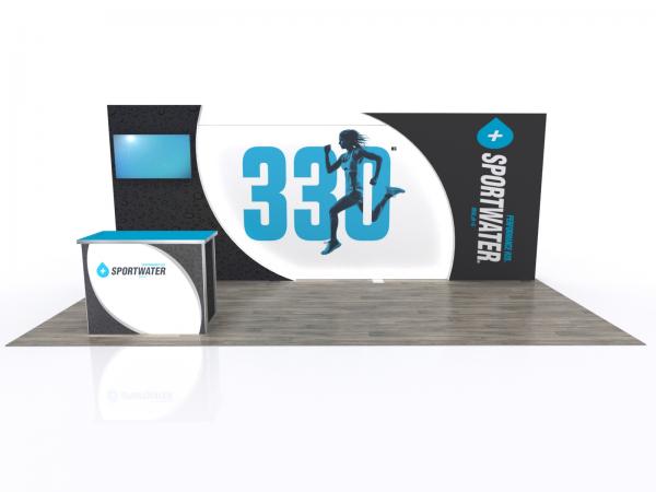 These distinctive Inline lightbox designs blend exceptionally bright LED lights, an aluminum SEG frame, and vibrant fabric graphics into a brilliant eye-catching display. The large LED lightbox spans the display and is framed with curved laminated panels. The left section supports a large monitor. Upfront there's a modified MOD-1700 reception counter with USB charging ports. The design includes integrated cord management. You won't believe your eyes the first time you flip the switch and see how stunning your backlit graphic can be.